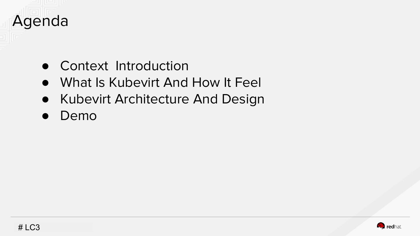 2 .Agenda ● Context Introduction ● What Is Kubevirt And How It Feel ● Kubevirt Architecture And Design ● Demo #INSERT LC3DESIGNATOR, IF NEEDED