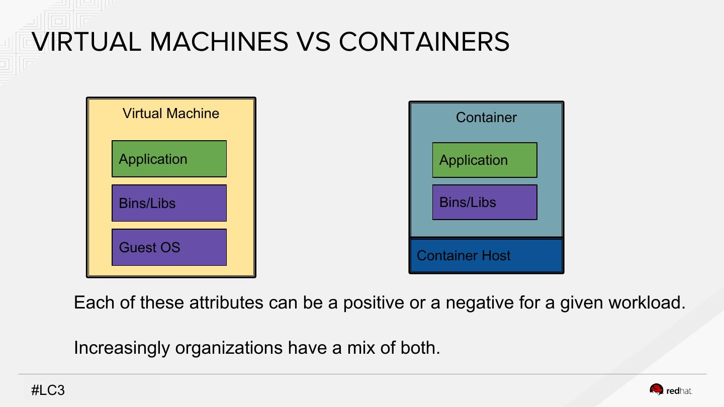 6 .VIRTUAL MACHINES VS CONTAINERS Virtual Machine Container Application Application Bins/Libs Bins/Libs Guest OS Container Host Each of these attributes can be a positive or a negative for a given workload. Increasingly organizations have a mix of both. #LC3 INSERT DESIGNATOR, IF NEEDED