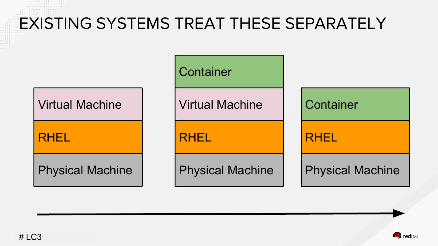7 .EXISTING SYSTEMS TREAT THESE SEPARATELY Container Virtual Machine Virtual Machine Container RHEL RHEL RHEL Physical Machine Physical Machine Physical Machine #INSERT LC3DESIGNATOR, IF NEEDED