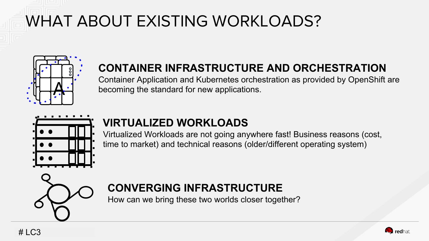 8 . WHAT ABOUT EXISTING WORKLOADS? CONTAINER INFRASTRUCTURE AND ORCHESTRATION Container Application and Kubernetes orchestration as provided by OpenShift are A becoming the standard for new applications. VIRTUALIZED WORKLOADS Virtualized Workloads are not going anywhere fast! Business reasons (cost, time to market) and technical reasons (older/different operating system) CONVERGING INFRASTRUCTURE How can we bring these two worlds closer together? #INSERT LC3DESIGNATOR, IF NEEDED
