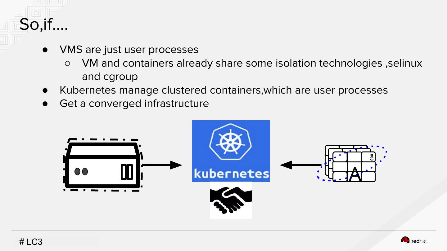 9 .So,if…. ● VMS are just user processes ○ VM and containers already share some isolation technologies ,selinux and cgroup ● Kubernetes manage clustered containers,which are user processes ● Get a converged infrastructure A #INSERT LC3DESIGNATOR, IF NEEDED