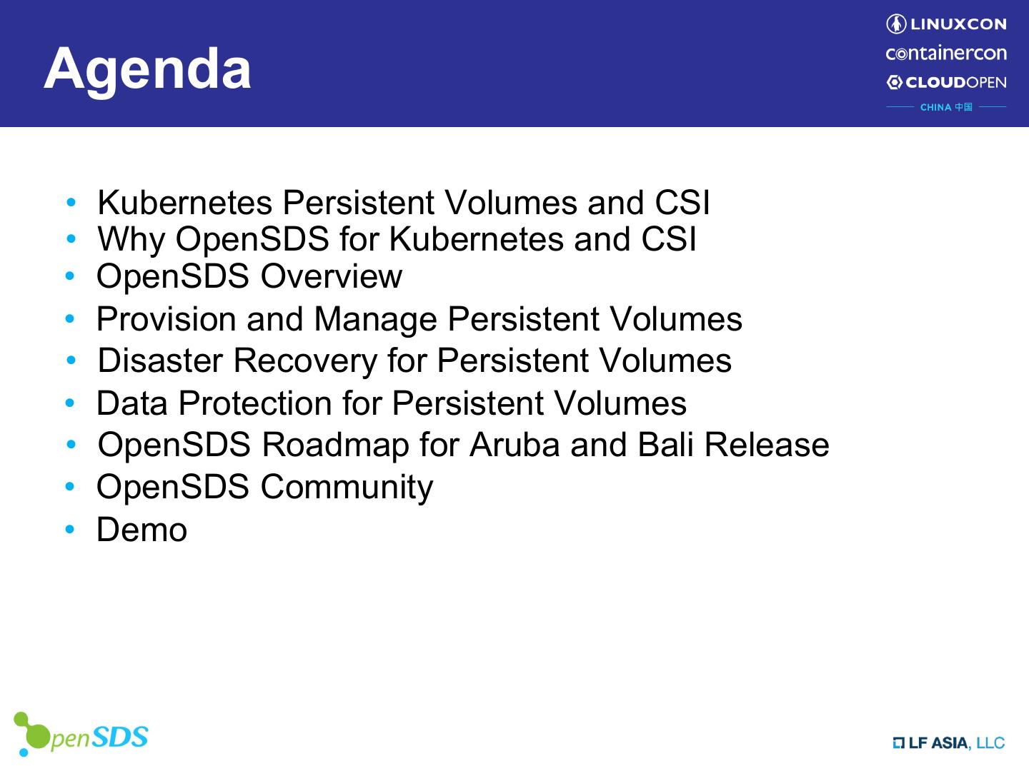 2 .Agenda • Kubernetes Persistent Volumes and CSI • Why OpenSDS for Kubernetes and CSI • OpenSDS Overview • Provision and Manage Persistent Volumes • Disaster Recovery for Persistent Volumes • Data Protection for Persistent Volumes • OpenSDS Roadmap for Aruba and Bali Release • OpenSDS Community • Demo