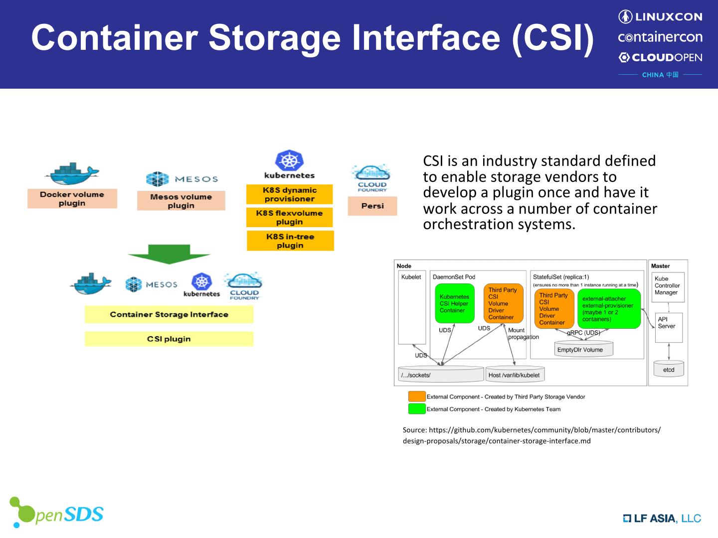 4 .Container Storage Interface (CSI) CSI is an industry standard defined to enable storage vendors to develop a plugin once and have it work across a number of container orchestration systems. Source: https://github.com/kubernetes/community/blob/master/contributors/ design-proposals/storage/container-storage-interface.md
