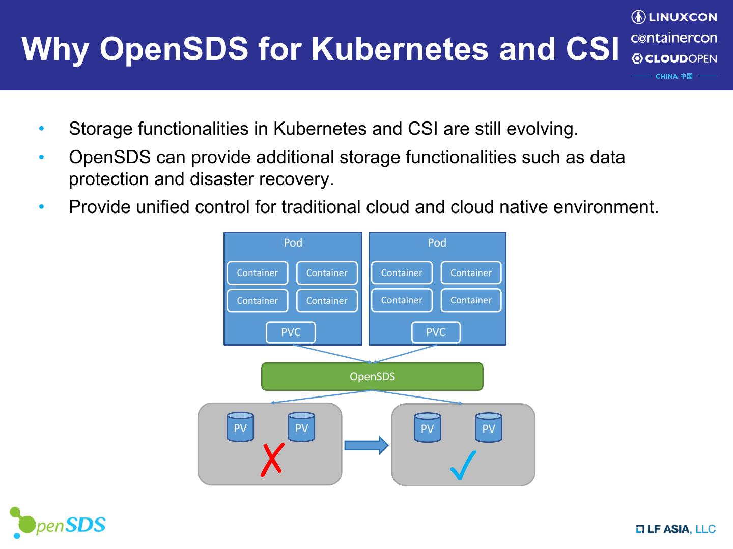 6 .Why OpenSDS for Kubernetes and CSI • Storage functionalities in Kubernetes and CSI are still evolving. • OpenSDS can provide additional storage functionalities such as data protection and disaster recovery. • Provide unified control for traditional cloud and cloud native environment. Pod Pod Container Container Container Container Container Container Container Container PVC PVC OpenSDS PV PV PV PV ✗ ✓
