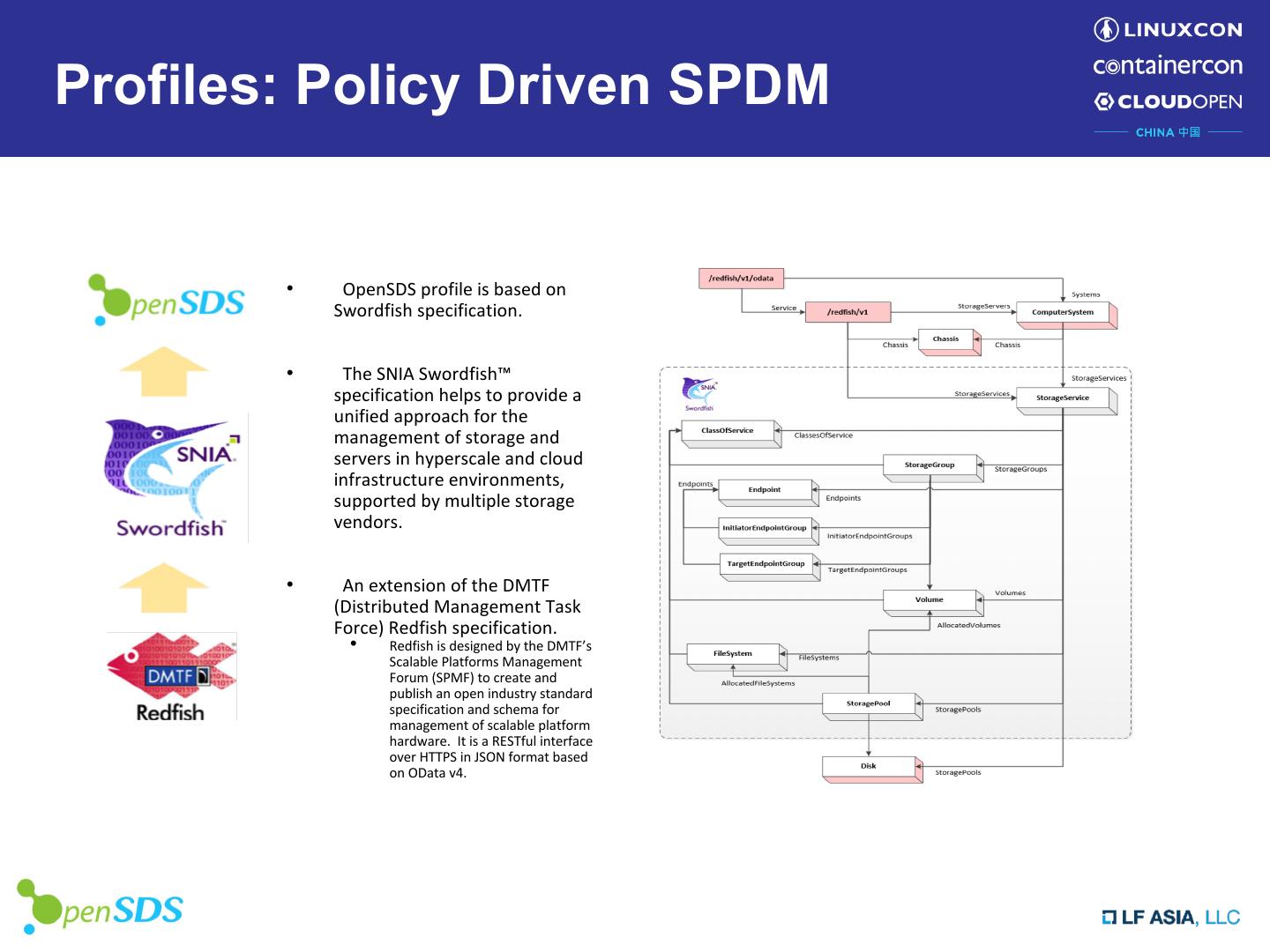 12 .Profiles: Policy Driven SPDM • OpenSDS profile is based on Swordfish specification. • The SNIA Swordfish™ specification helps to provide a unified approach for the management of storage and servers in hyperscale and cloud infrastructure environments, supported by multiple storage vendors. • An extension of the DMTF (Distributed Management Task Force) Redfish specification. • Redfish is designed by the DMTF’s Scalable Platforms Management Forum (SPMF) to create and publish an open industry standard specification and schema for management of scalable platform hardware. It is a RESTful interface over HTTPS in JSON format based on OData v4.