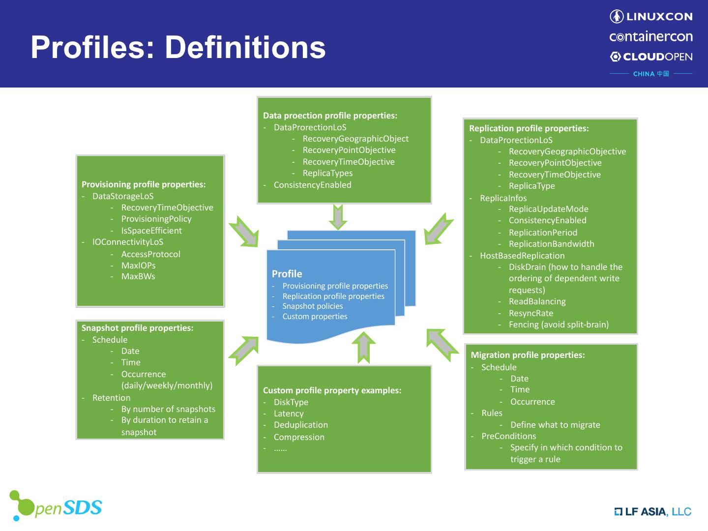 13 .Profiles: Definitions Data proection profile properties: - DataProrectionLoS Replication profile properties: - RecoveryGeographicObject - DataProrectionLoS - RecoveryPointObjective - RecoveryGeographicObjective - RecoveryTimeObjective - RecoveryPointObjective - ReplicaTypes - RecoveryTimeObjective Provisioning profile properties: - ConsistencyEnabled - ReplicaType - DataStorageLoS - ReplicaInfos - RecoveryTimeObjective - ReplicaUpdateMode - ProvisioningPolicy - ConsistencyEnabled - IsSpaceEfficient - ReplicationPeriod - IOConnectivityLoS - ReplicationBandwidth - AccessProtocol - HostBasedReplication - MaxIOPs - DiskDrain (how to handle the - MaxBWs Profile ordering of dependent write - Provisioning profile properties requests) - Replication profile properties - Snapshot policies - ReadBalancing - Custom properties - ResyncRate Snapshot profile properties: - Fencing (avoid split-brain) - Schedule - Date Migration profile properties: - Time - Schedule - Occurrence - Date (daily/weekly/monthly) - Time Custom profile property examples: - Retention - Occurrence - DiskType - By number of snapshots - Latency - Rules - By duration to retain a - Deduplication - Define what to migrate snapshot - PreConditions - Compression - …… - Specify in which condition to trigger a rule