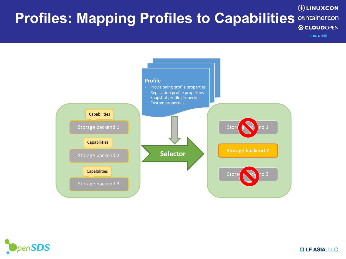 14 .Profiles: Mapping Profiles to Capabilities Profile - Provisioning profile properties - Replication profile properties - Snapshot profile properties - Custom properties Capabilities Storage backend 1 Storage backend 1 Capabilities Storage backend 2 Storage backend 2 Selector Capabilities Storage backend 3 Storage backend 3