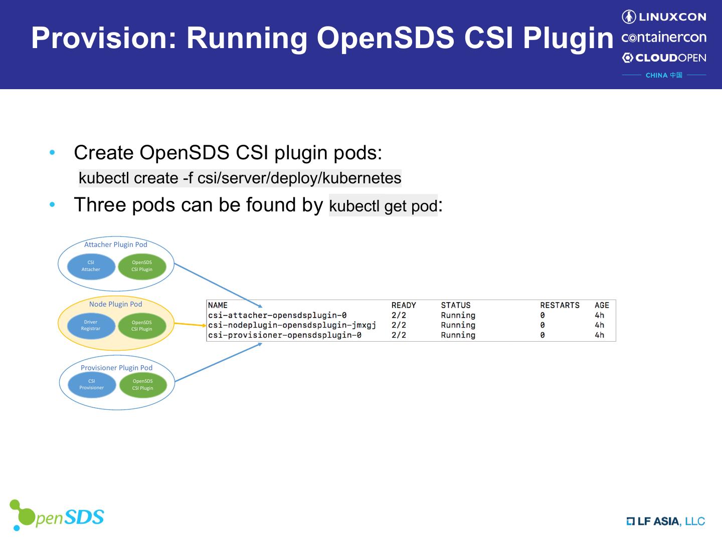 16 .Provision: Running OpenSDS CSI Plugin • Create OpenSDS CSI plugin pods: kubectl create -f csi/server/deploy/kubernetes • Three pods can be found by kubectl get pod: Attacher Plugin Pod CSI OpenSDS Attacher CSI Plugin Node Plugin Pod Driver OpenSDS Registrar CSI Plugin Provisioner Plugin Pod CSI OpenSDS Provisioner CSI Plugin
