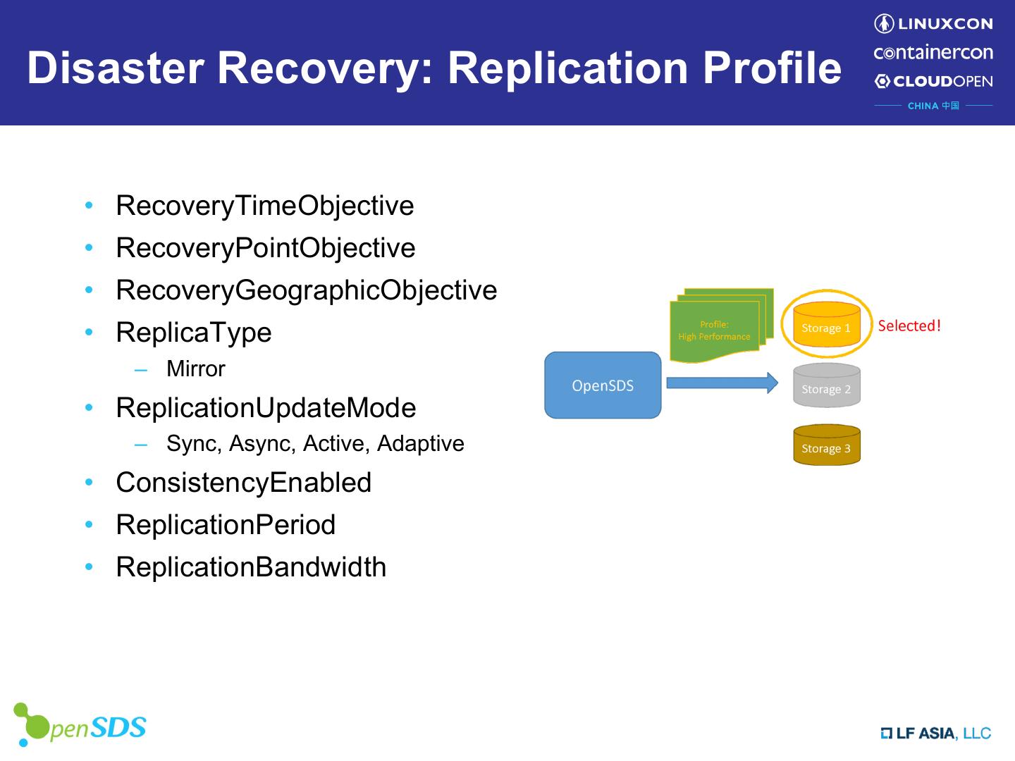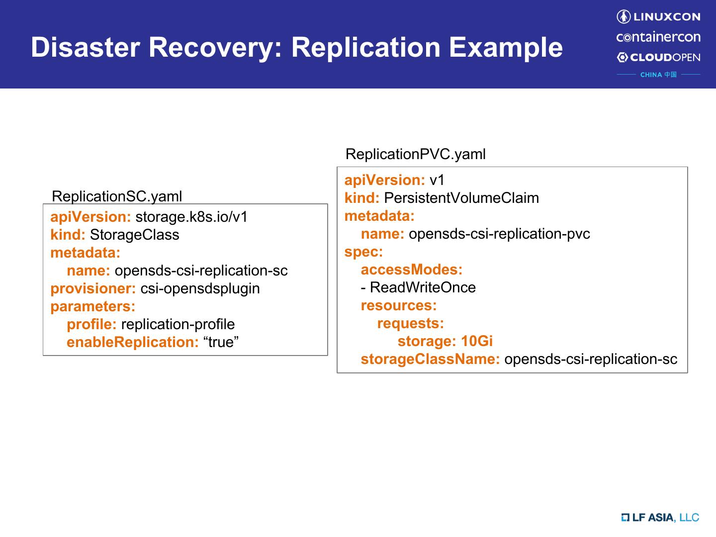 19 .Disaster Recovery: Replication Example ReplicationPVC.yaml apiVersion: v1 ReplicationSC.yaml kind: PersistentVolumeClaim apiVersion: storage.k8s.io/v1 metadata: kind: StorageClass name: opensds-csi-replication-pvc metadata: spec: name: opensds-csi-replication-sc accessModes: provisioner: csi-opensdsplugin - ReadWriteOnce parameters: resources: profile: replication-profile requests: enableReplication: “true” storage: 10Gi storageClassName: opensds-csi-replication-sc