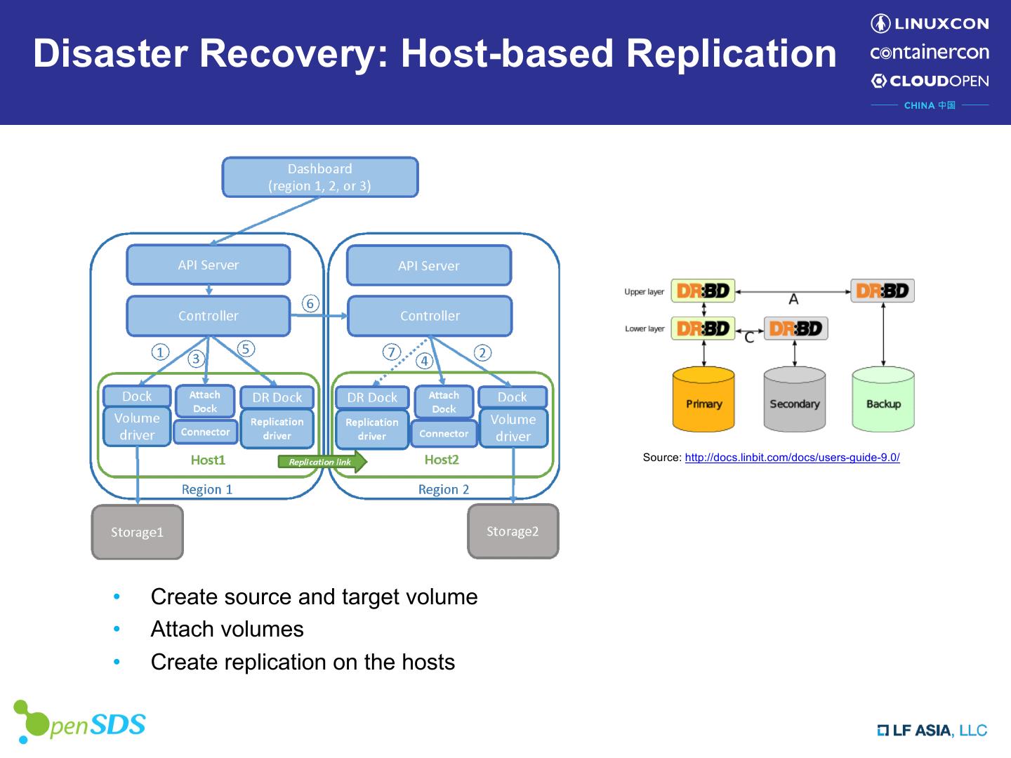 21 .Disaster Recovery: Host-based Replication Source: http://docs.linbit.com/docs/users-guide-9.0/ • Create source and target volume • Attach volumes • Create replication on the hosts