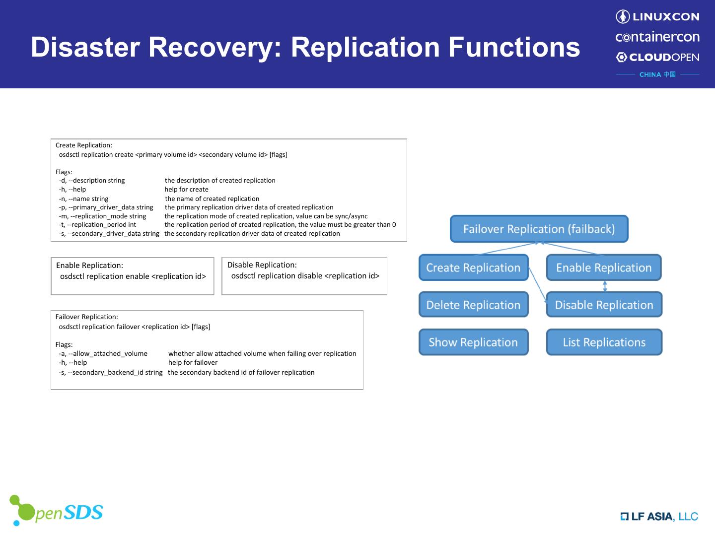 22 .Disaster Recovery: Replication Functions Create Replication: osdsctl replication create <primary volume id> <secondary volume id> [flags] Flags: -d, --description string the description of created replication -h, --help help for create -n, --name string the name of created replication -p, --primary_driver_data string the primary replication driver data of created replication -m, --replication_mode string the replication mode of created replication, value can be sync/async -t, --replication_period int the replication period of created replication, the value must be greater than 0 -s, --secondary_driver_data string the secondary replication driver data of created replication Enable Replication: Disable Replication: osdsctl replication enable <replication id> osdsctl replication disable <replication id> Failover Replication: osdsctl replication failover <replication id> [flags] Flags: -a, --allow_attached_volume whether allow attached volume when failing over replication -h, --help help for failover -s, --secondary_backend_id string the secondary backend id of failover replication