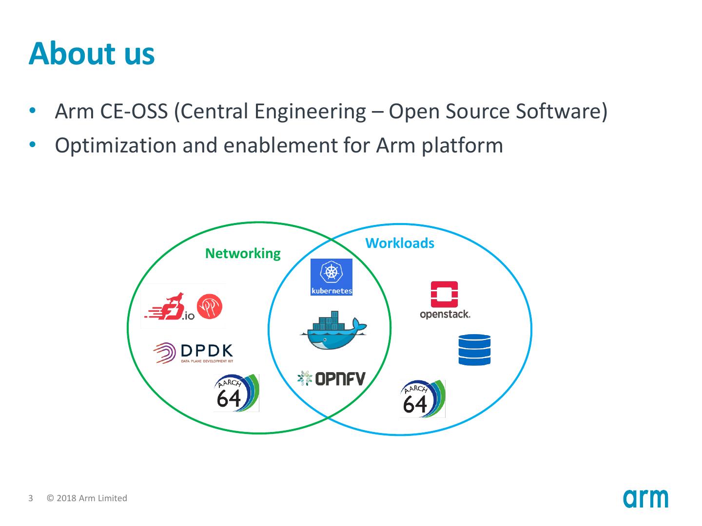 3 .About us • Arm CE-OSS (Central Engineering – Open Source Software) • Optimization and enablement for Arm platform Workloads Networking 3 © 2018 Arm Limited