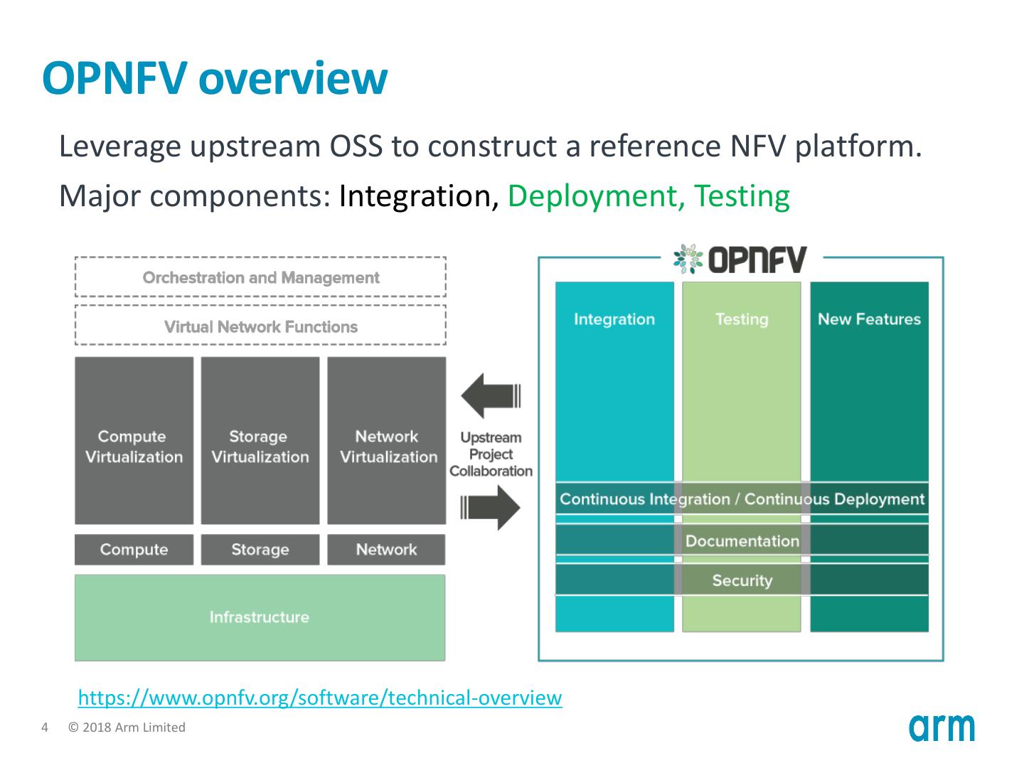 4 .OPNFV overview Leverage upstream OSS to construct a reference NFV platform. Major components: Integration, Deployment, Testing https://www.opnfv.org/software/technical-overview 4 © 2018 Arm Limited