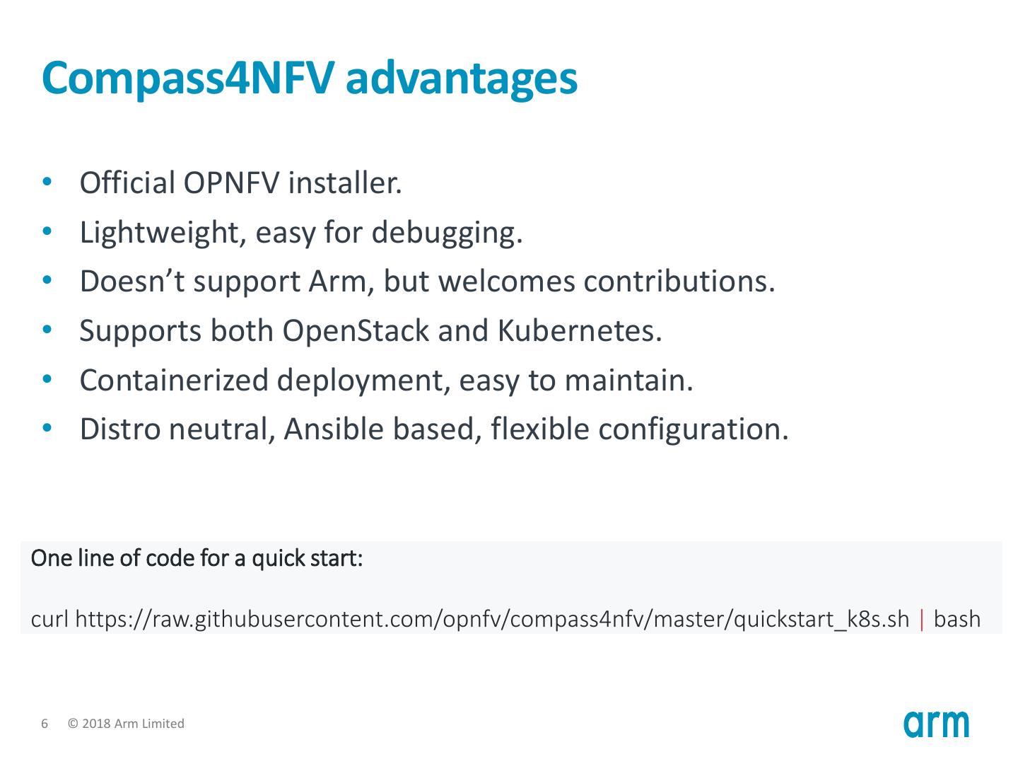 6 . Compass4NFV advantages • Official OPNFV installer. • Lightweight, easy for debugging. • Doesn’t support Arm, but welcomes contributions. • Supports both OpenStack and Kubernetes. • Containerized deployment, easy to maintain. • Distro neutral, Ansible based, flexible configuration. One line of code for a quick start: curl https://raw.githubusercontent.com/opnfv/compass4nfv/master/quickstart_k8s.sh | bash 6 © 2018 Arm Limited