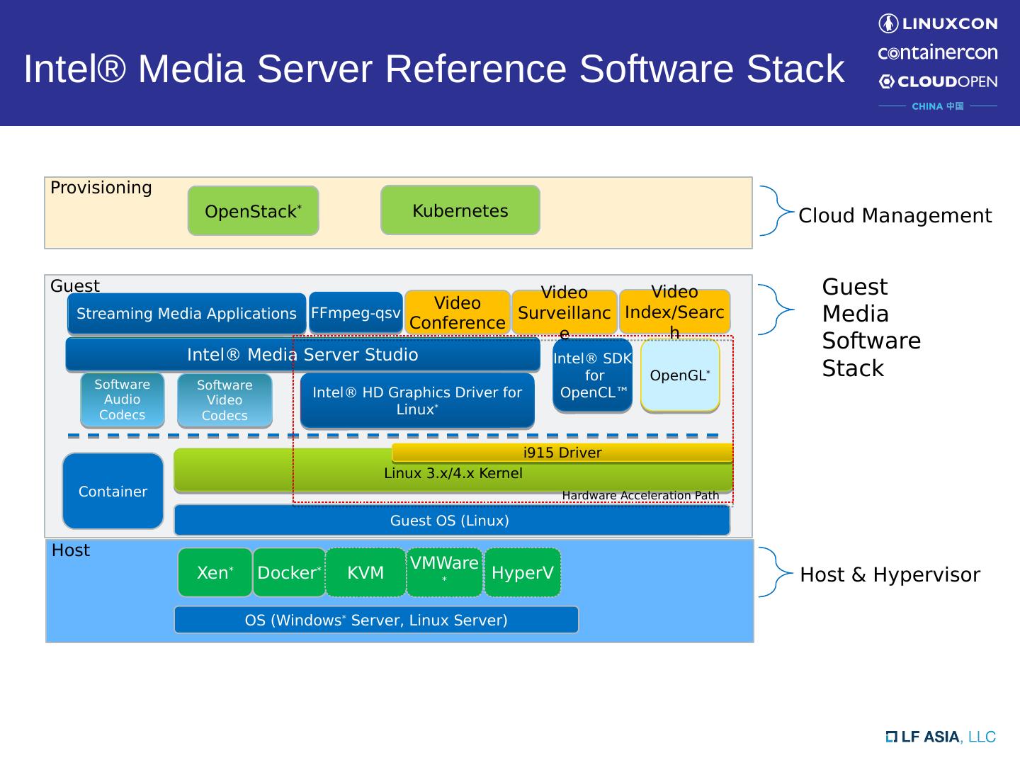 4 .Intel® Media Server Reference Software Stack Guest Host Xen * Docker * KVM VMWare * OS (Windows * Server, Linux Server) HyperV Guest OS (Linux) Provisioning OpenStack * Linux 3.x/4.x Kernel Intel® Media Server Studio Software Video Codecs i915 Driver Software Audio Codecs Streaming Media Applications Hardware Acceleration Path OpenGL * Intel® SDK for OpenCL ™ Intel® HD Graphics Driver for Linux * Video Conference Video Surveillance Guest Media Software Stack Host & Hypervisor Cloud Management Video Index/Search Kubernetes FFmpeg-qsv Container
