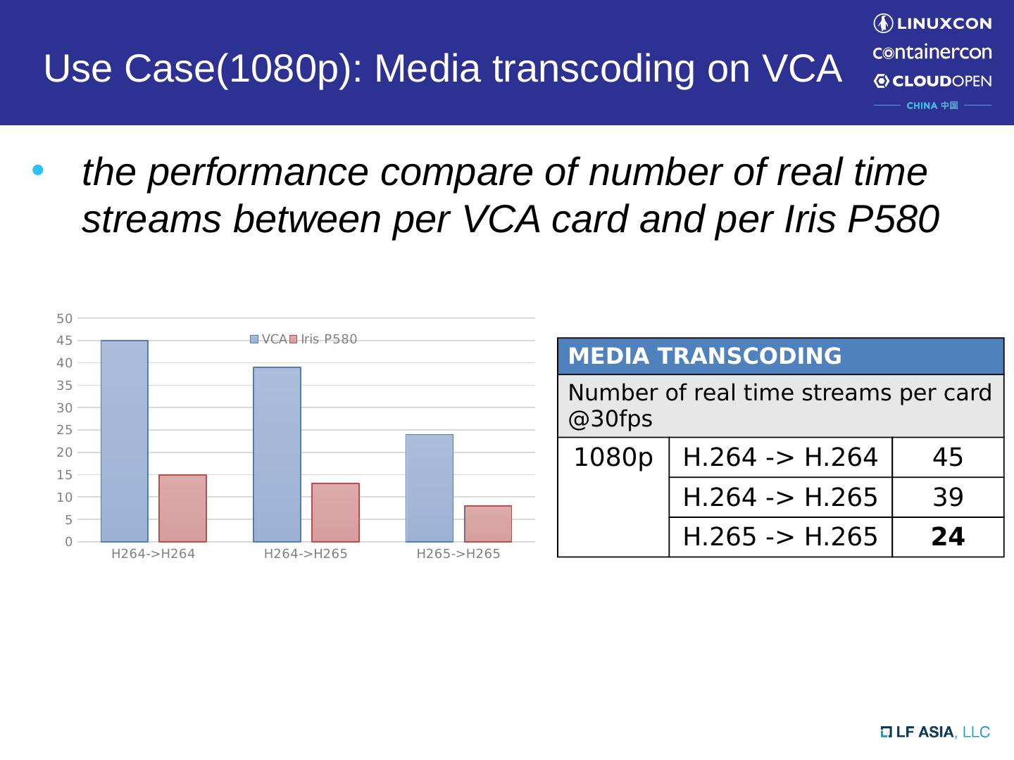 13 .Use Case(1080p): Media transcoding on VCA the performance compare of number of real time streams between per VCA card and per Iris P580 MEDIA TRANSCODING Number of real time streams per card @30fps 1080p H.264 -> H.264 45 H.264 -> H.265 39 H.265 -> H.265 24