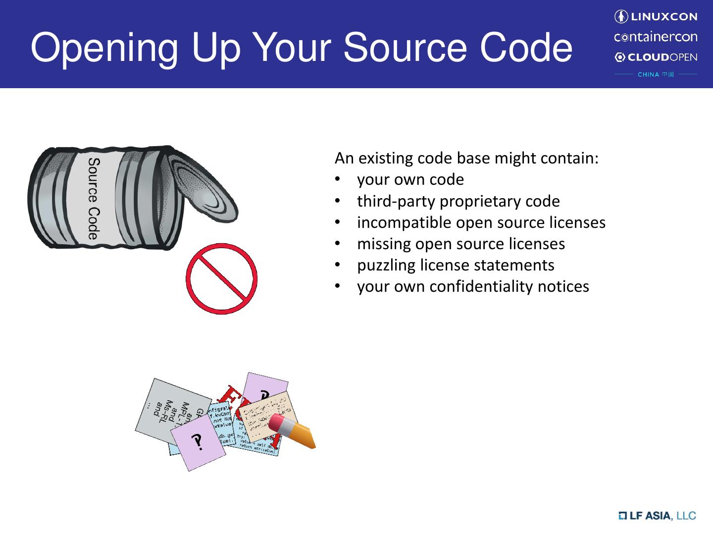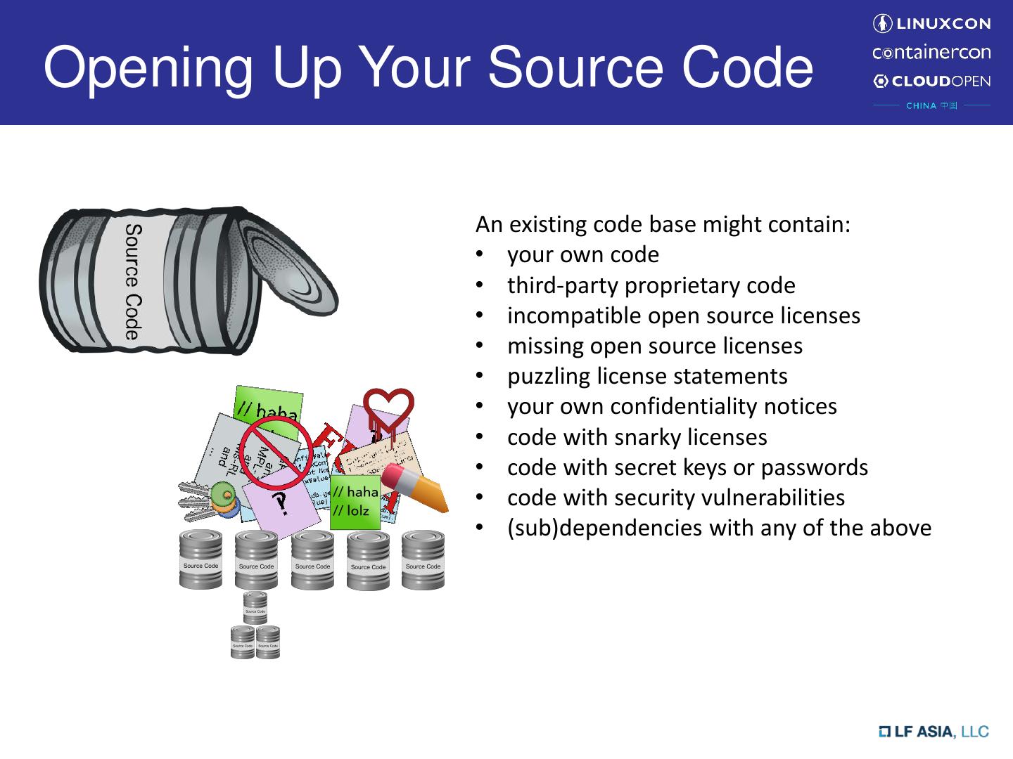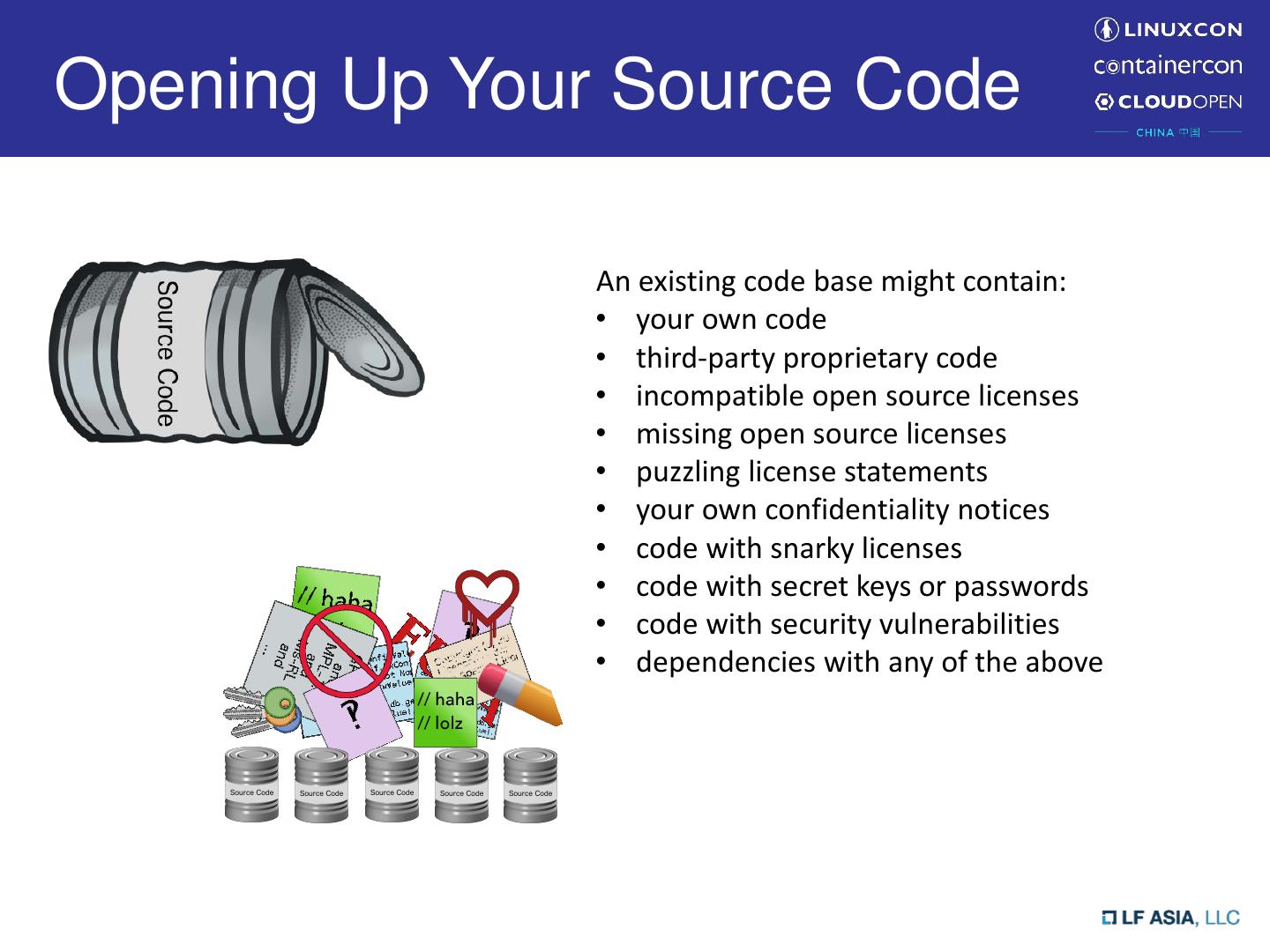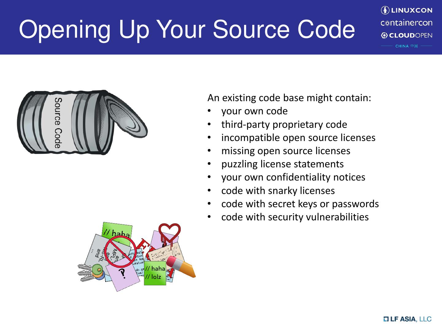 17 .Opening Up Your Source Code An existing code base might contain: • your own code • third-party proprietary code • incompatible open source licenses • missing open source licenses • puzzling license statements • your own confidentiality notices • code with snarky licenses • code with secret keys or passwords • code with security vulnerabilities