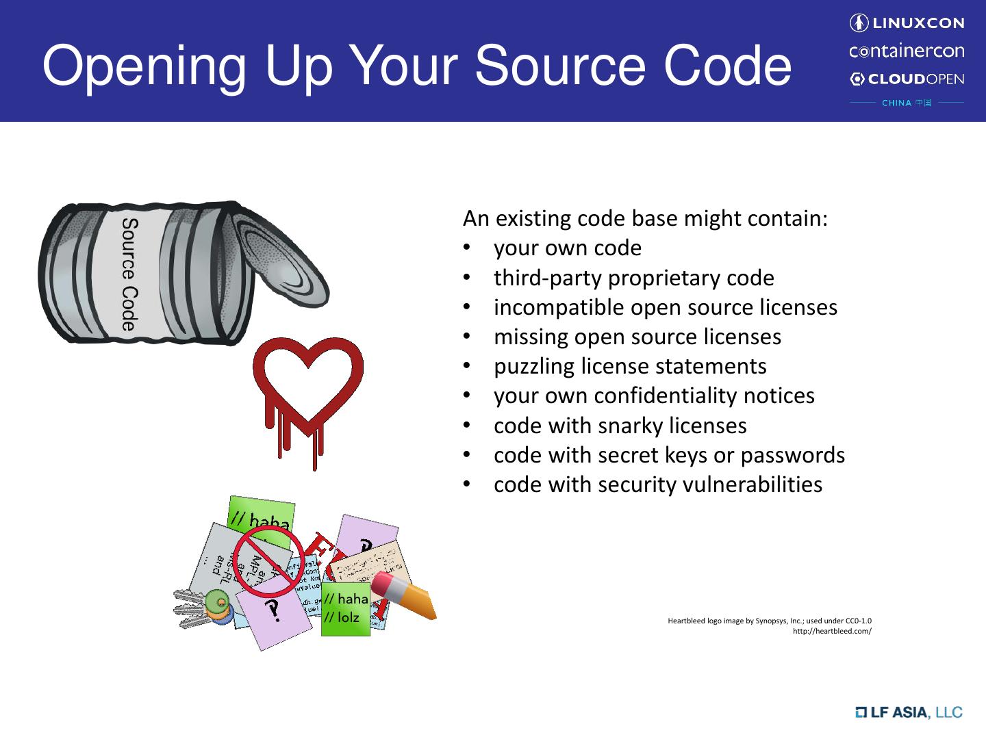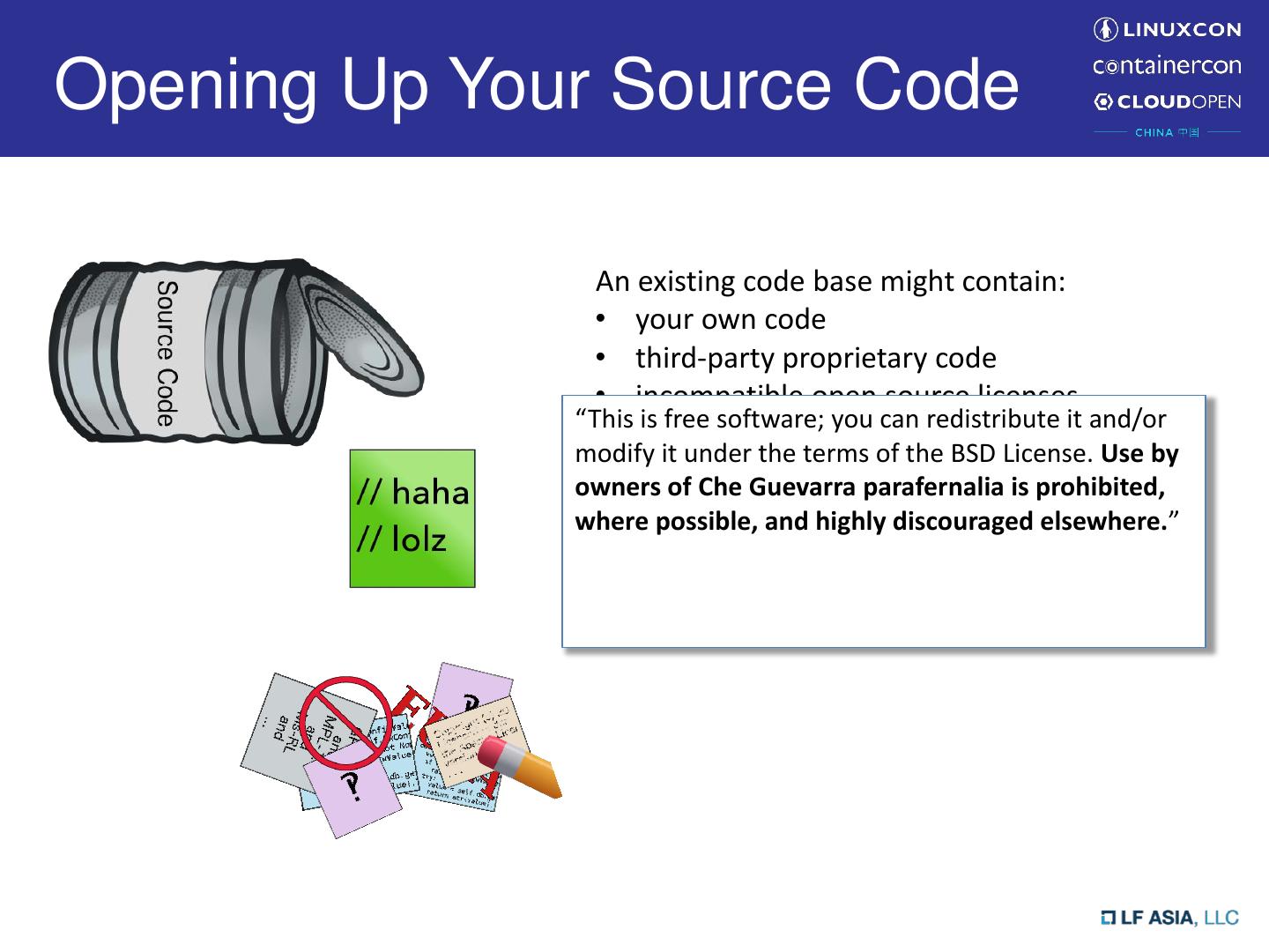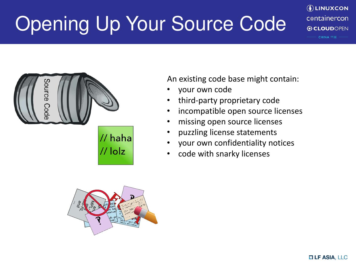 17 .Opening Up Your Source Code An existing code base might contain: • your own code • third-party proprietary code • incompatible open source licenses • missing open source licenses • puzzling license statements • your own confidentiality notices • code with snarky licenses • code with secret keys or passwords • code with security vulnerabilities