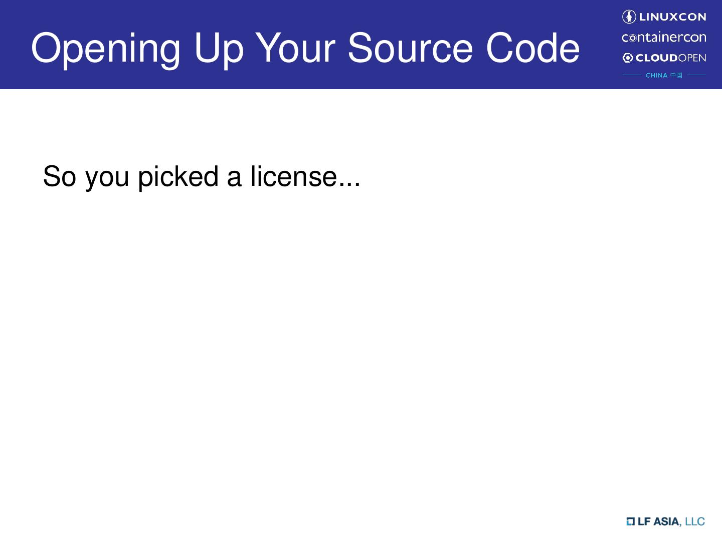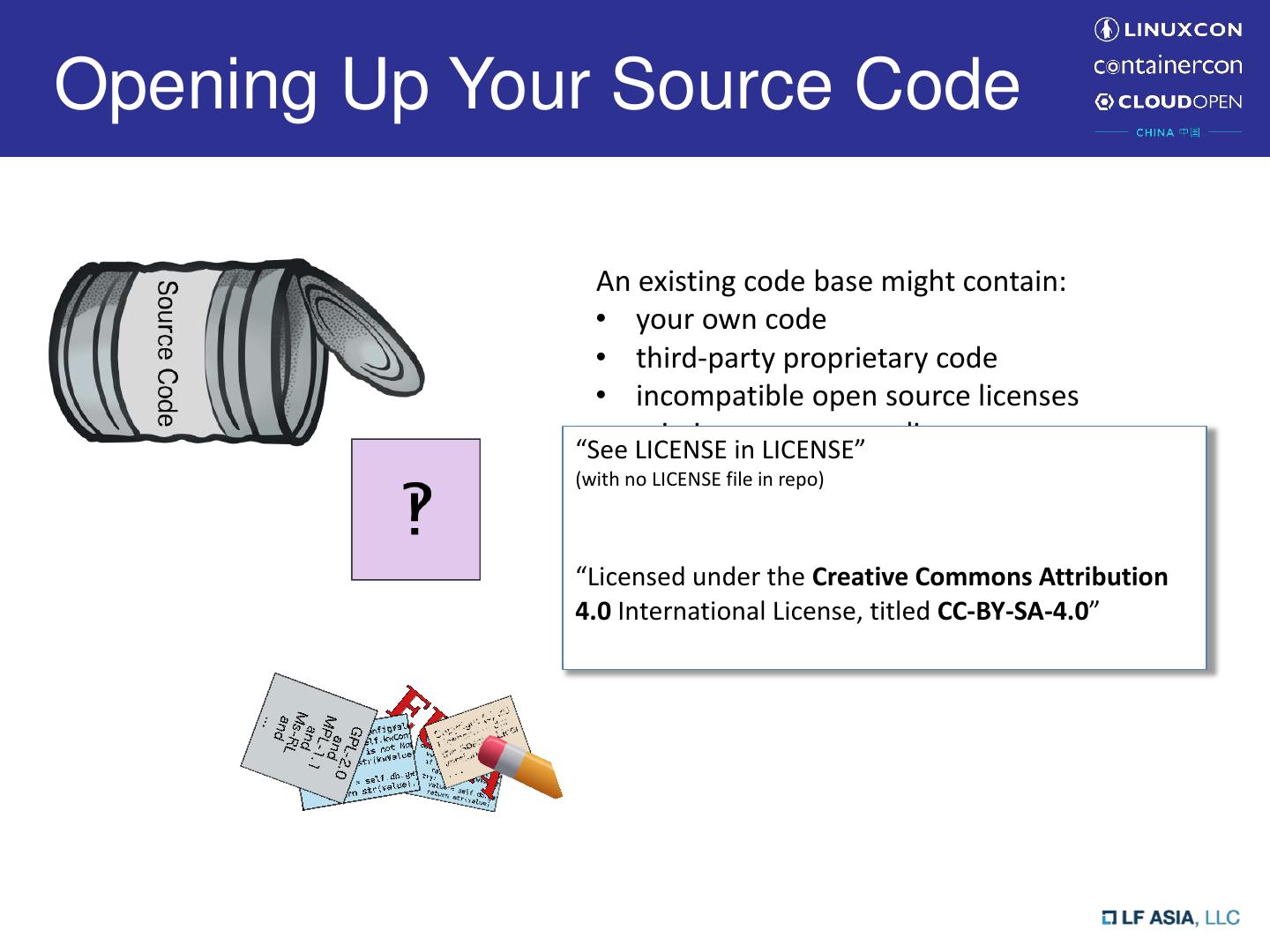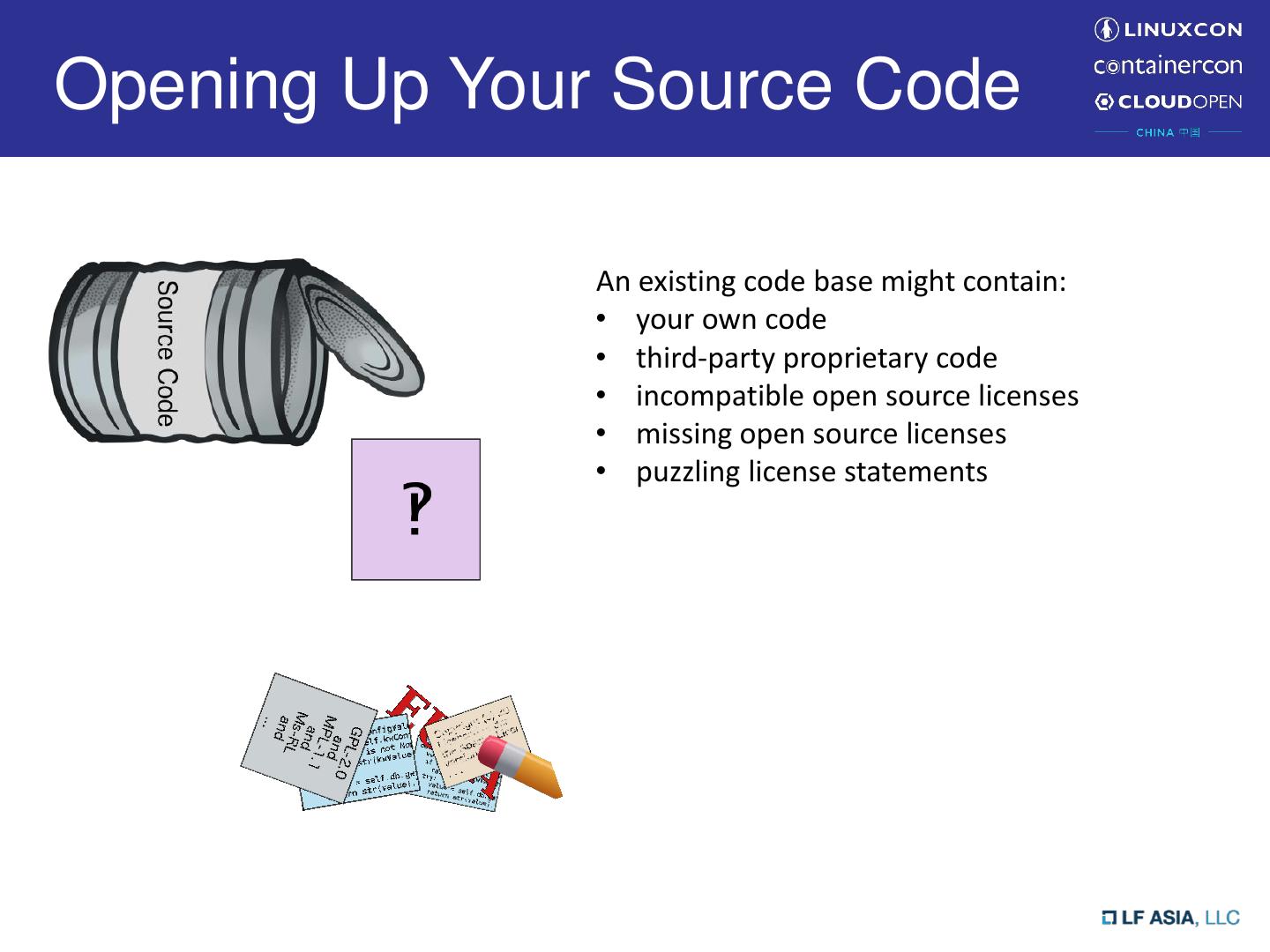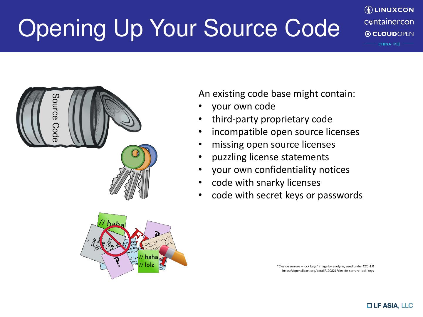 17 .Opening Up Your Source Code An existing code base might contain: • your own code • third-party proprietary code • incompatible open source licenses • missing open source licenses • puzzling license statements • your own confidentiality notices • code with snarky licenses • code with secret keys or passwords • code with security vulnerabilities