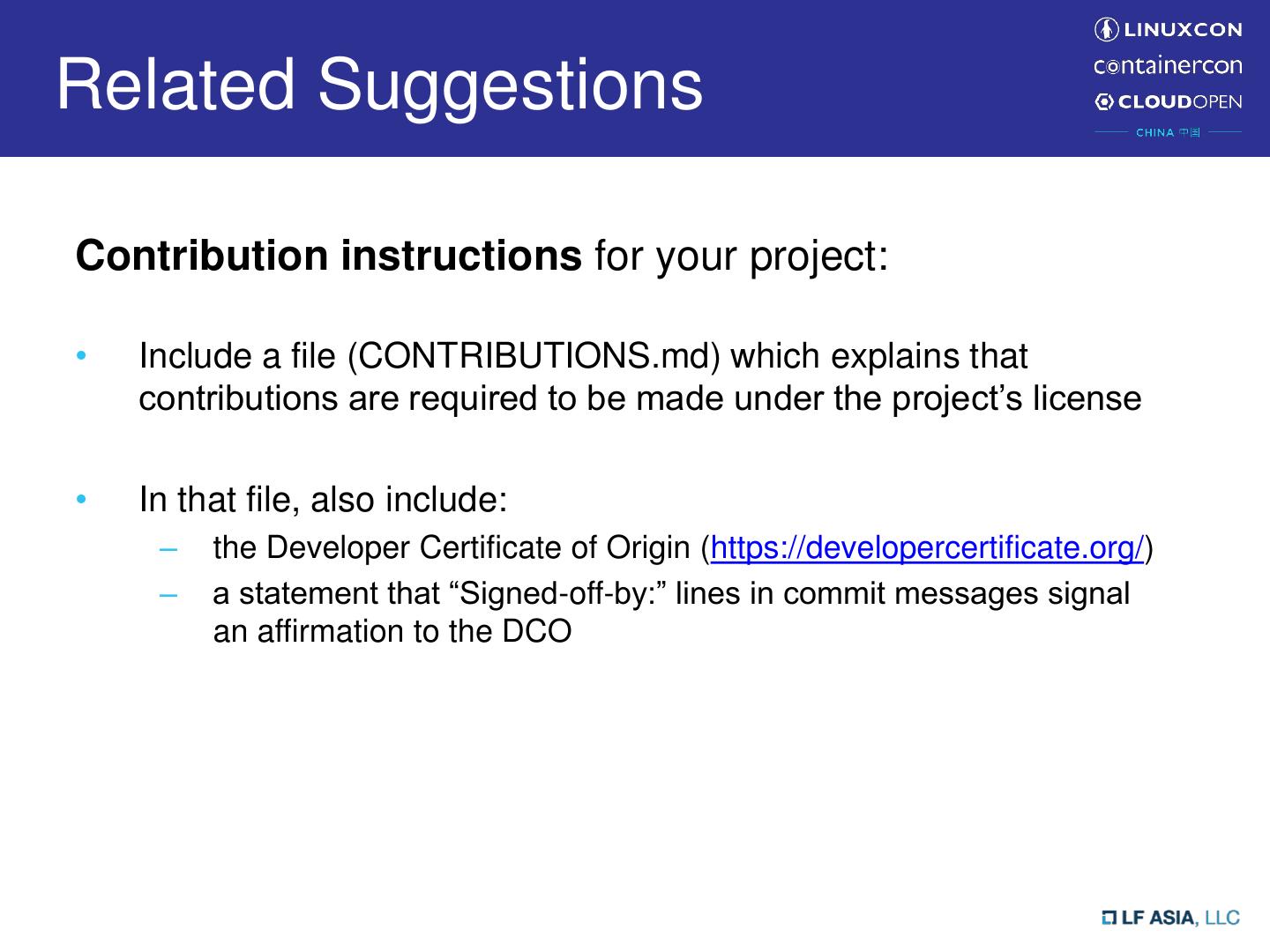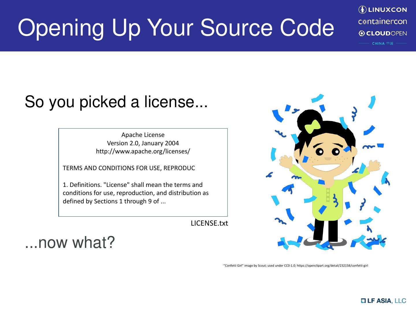3 .Opening Up Your Source Code So you picked a license... Apache License Version 2.0, January 2004 http://www.apache.org/licenses/ TERMS AND CONDITIONS FOR USE, REPRODUC 1. Definitions. "License" shall mean the terms and conditions for use, reproduction, and distribution as defined by Sections 1 through 9 of ... LICENSE.txt ...now what? ”Confetti Girl” image by Scout; used under CC0-1.0; https://openclipart.org/detail/232158/confetti-girl