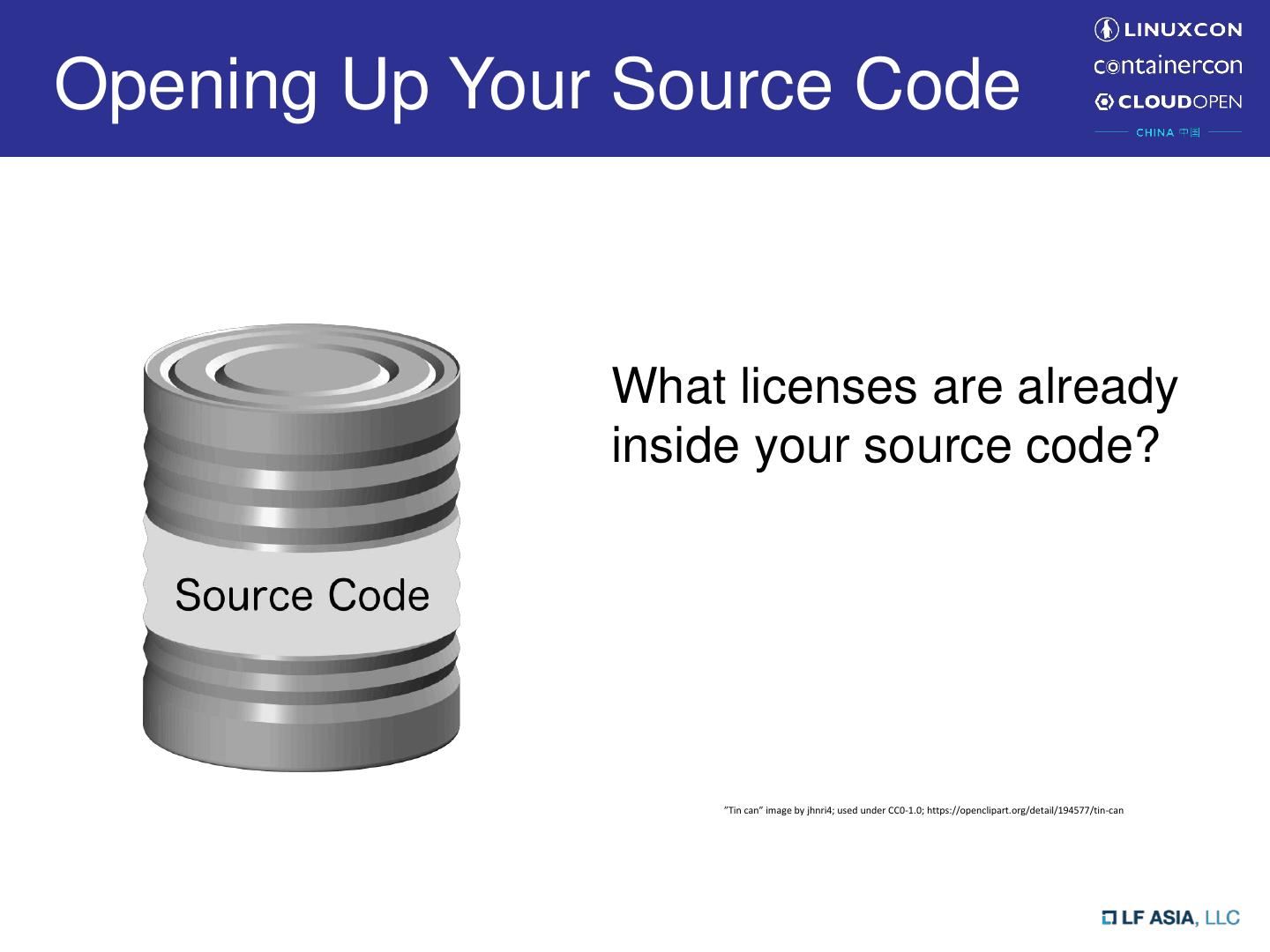 4 .Opening Up Your Source Code What licenses are already inside your source code? ”Tin can” image by jhnri4; used under CC0-1.0; https://openclipart.org/detail/194577/tin-can