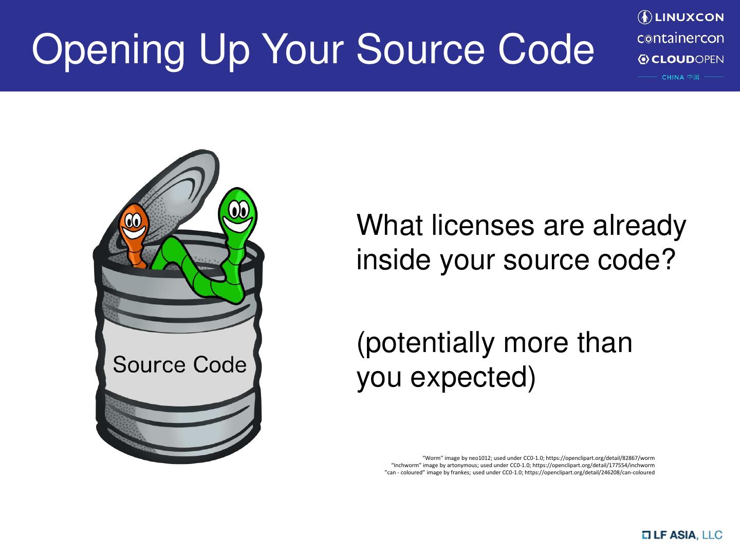5 .Opening Up Your Source Code What licenses are already inside your source code? (potentially more than you expected) “Worm” image by neo1012; used under CC0-1.0; https://openclipart.org/detail/82867/worm “Inchworm” image by artonymous; used under CC0-1.0; https://openclipart.org/detail/177554/inchworm ”can - coloured” image by frankes; used under CC0-1.0; https://openclipart.org/detail/246208/can-coloured