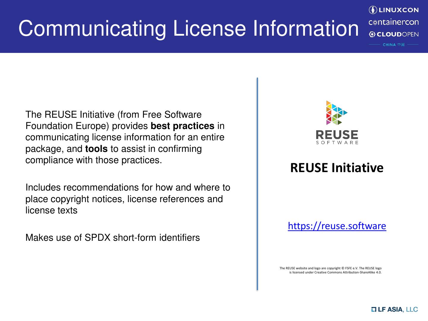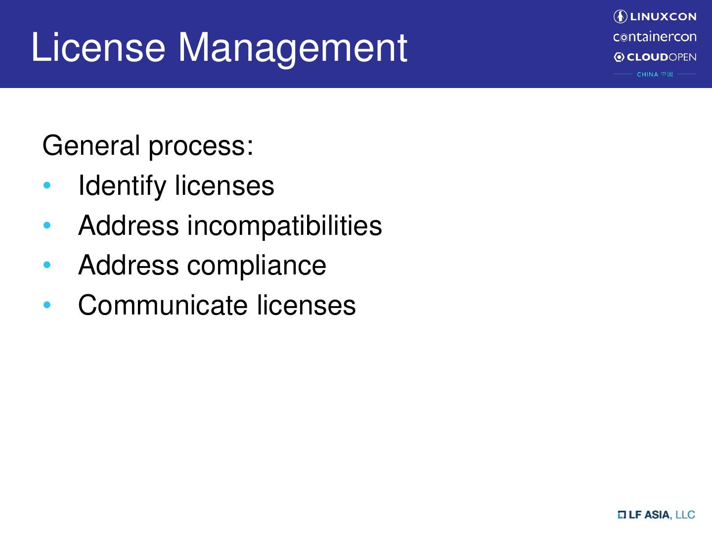 21 .License Management General process: • Identify licenses • Address incompatibilities • Address compliance • Communicate licenses