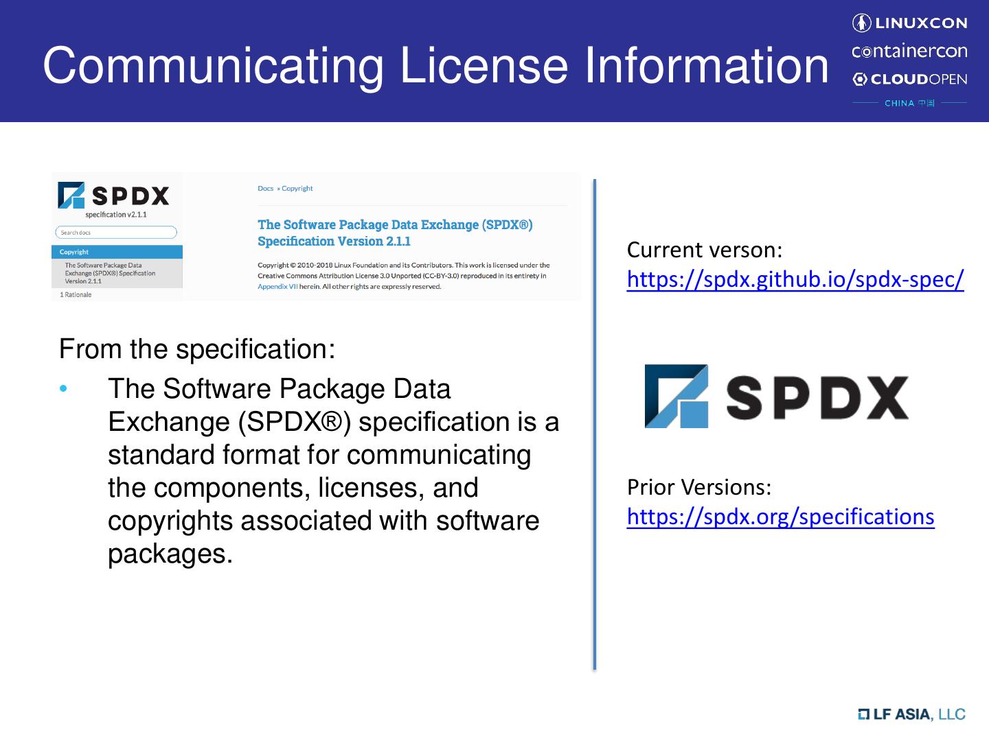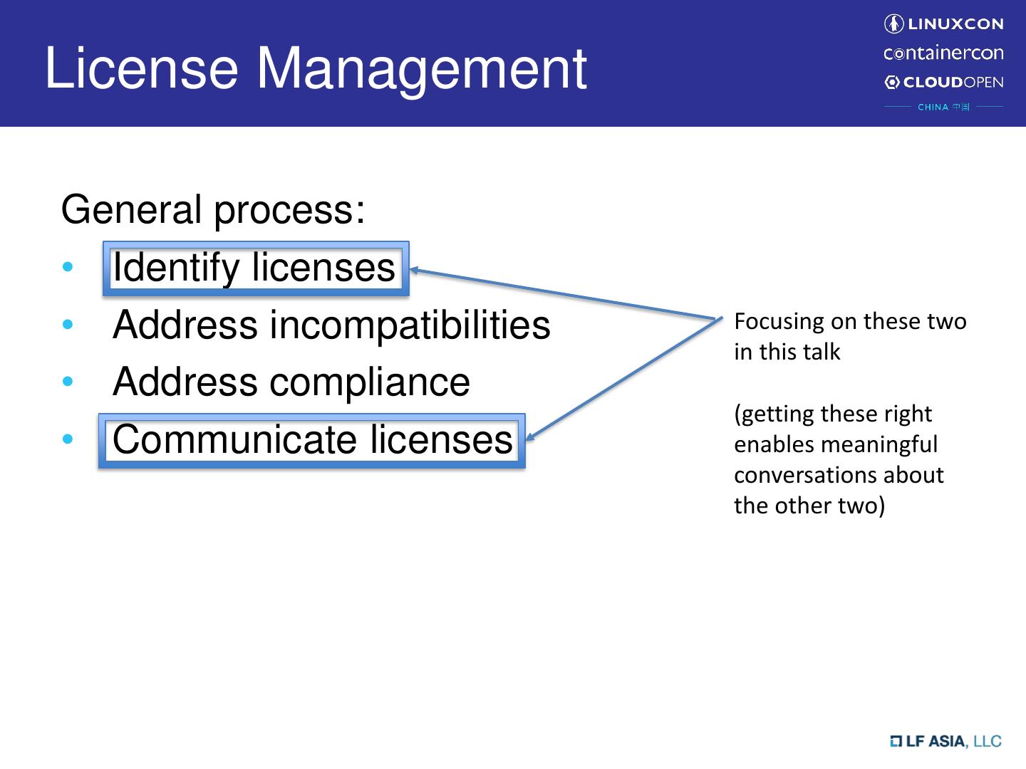 22 .License Management General process: • Identify licenses • Address incompatibilities Focusing on these two in this talk • Address compliance (getting these right • Communicate licenses enables meaningful conversations about the other two)