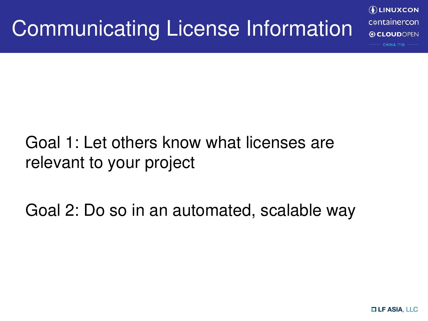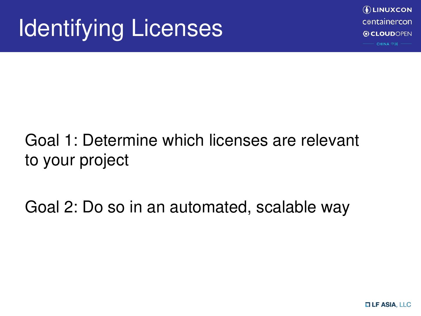 24 .Identifying Licenses Goal 1: Determine which licenses are relevant to your project Goal 2: Do so in an automated, scalable way