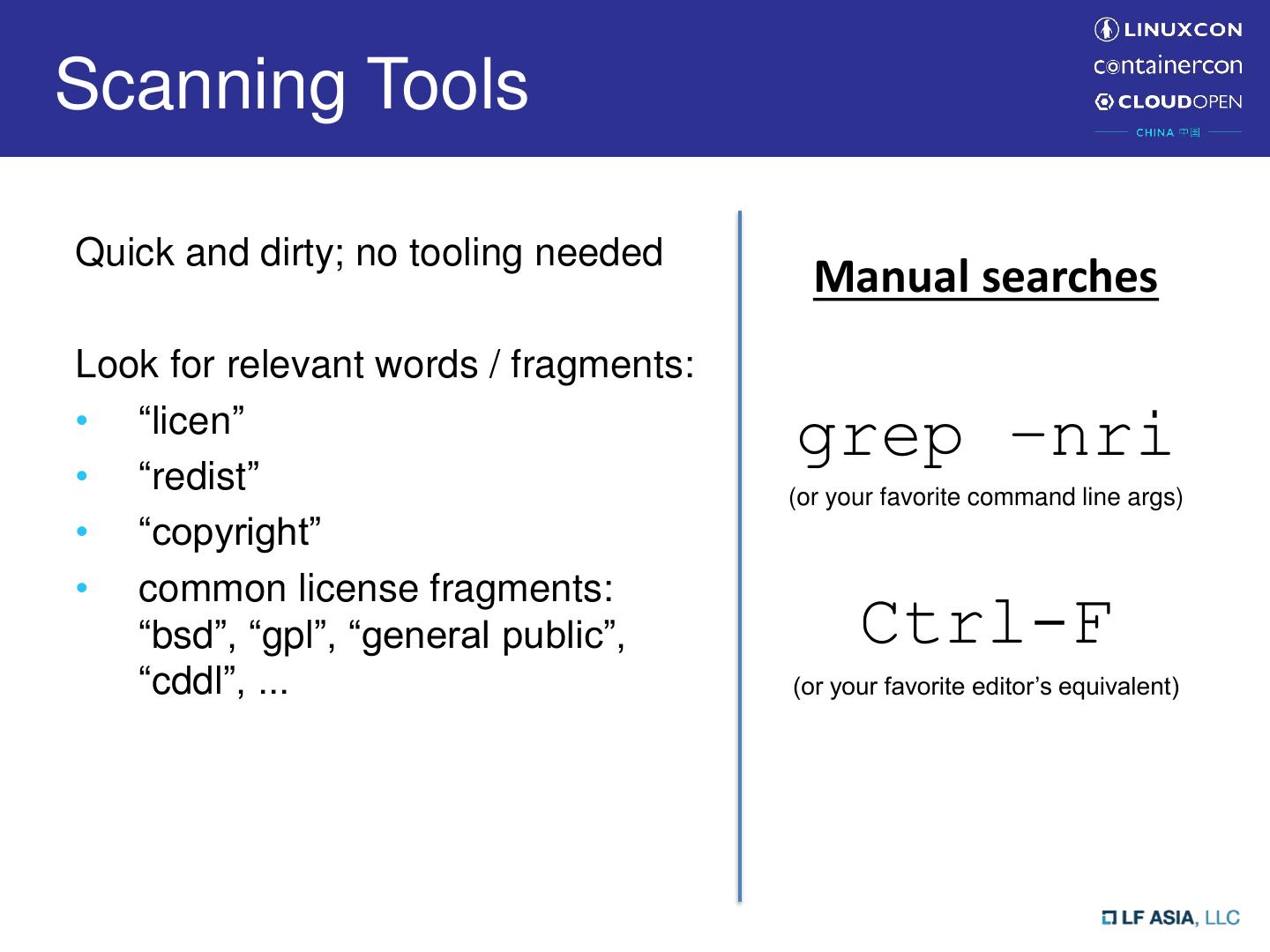26 .Scanning Tools Quick and dirty; no tooling needed Manual searches Look for relevant words / fragments: • “licen” • “redist” grep –nri (or your favorite command line args) • “copyright” • common license fragments: “bsd”, “gpl”, “general public”, Ctrl-F “cddl”, ... (or your favorite editor’s equivalent)