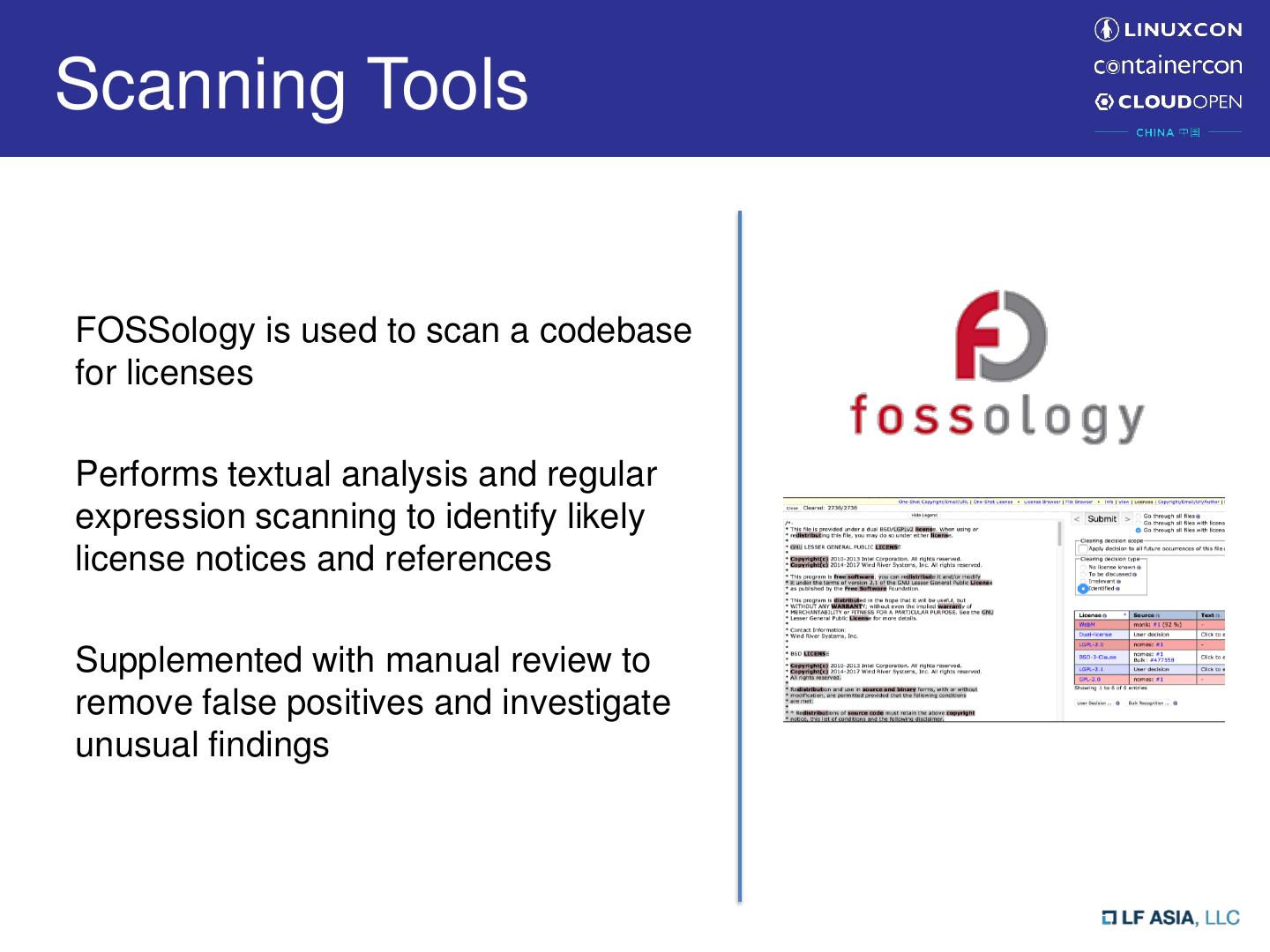 27 .Scanning Tools FOSSology is used to scan a codebase for licenses Performs textual analysis and regular expression scanning to identify likely license notices and references Supplemented with manual review to remove false positives and investigate unusual findings