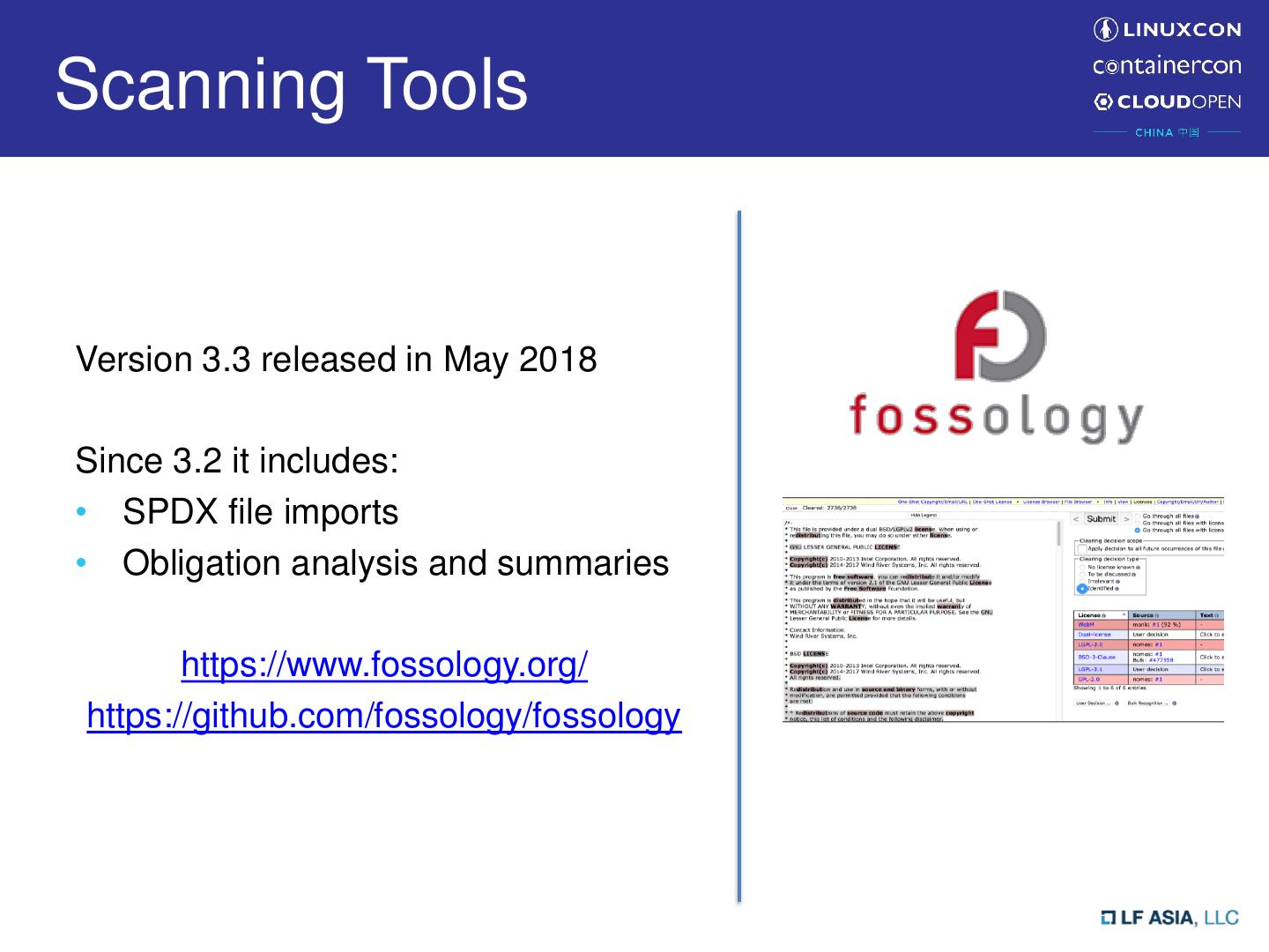 28 .Scanning Tools Version 3.3 released in May 2018 Since 3.2 it includes: • SPDX file imports • Obligation analysis and summaries https://www.fossology.org/ https://github.com/fossology/fossology