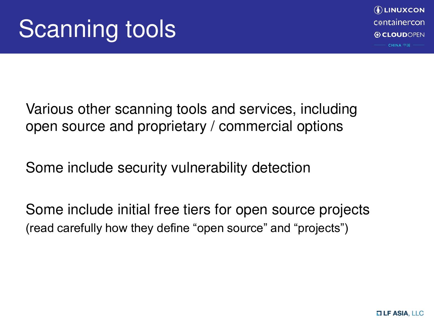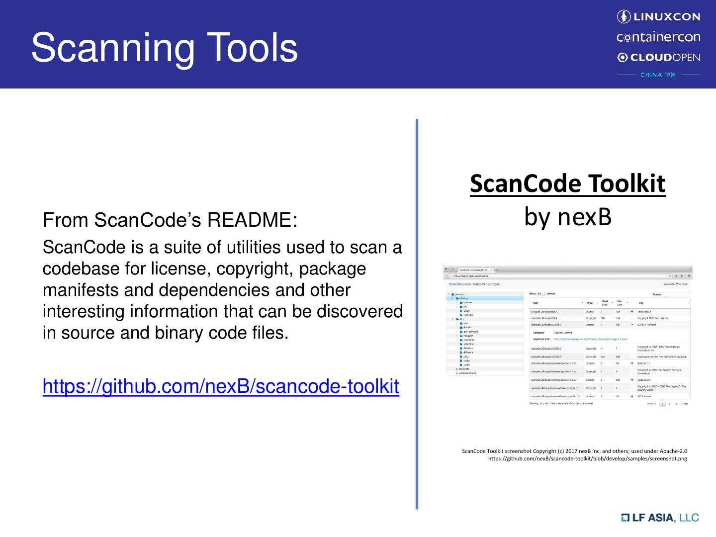 29 .Scanning Tools ScanCode Toolkit From ScanCode’s README: by nexB ScanCode is a suite of utilities used to scan a codebase for license, copyright, package manifests and dependencies and other interesting information that can be discovered in source and binary code files. https://github.com/nexB/scancode-toolkit ScanCode Toolkit screenshot Copyright (c) 2017 nexB Inc. and others; used under Apache-2.0 https://github.com/nexB/scancode-toolkit/blob/develop/samples/screenshot.png