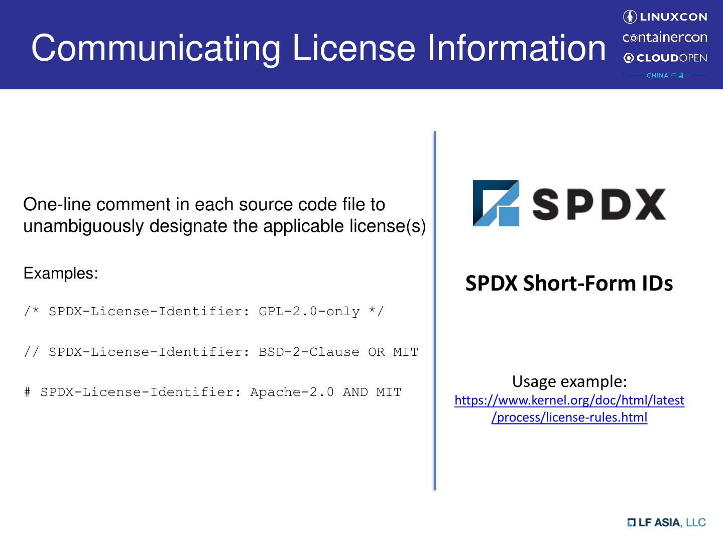 11 .Opening Up Your Source Code An existing code base might contain: • your own code • third-party proprietary code • incompatible open source licenses • missing open source licenses “See LICENSE in LICENSE” • nopuzzling (with LICENSE filelicense in repo) statements “Licensed under the Creative Commons Attribution 4.0 International License, titled CC-BY-SA-4.0”