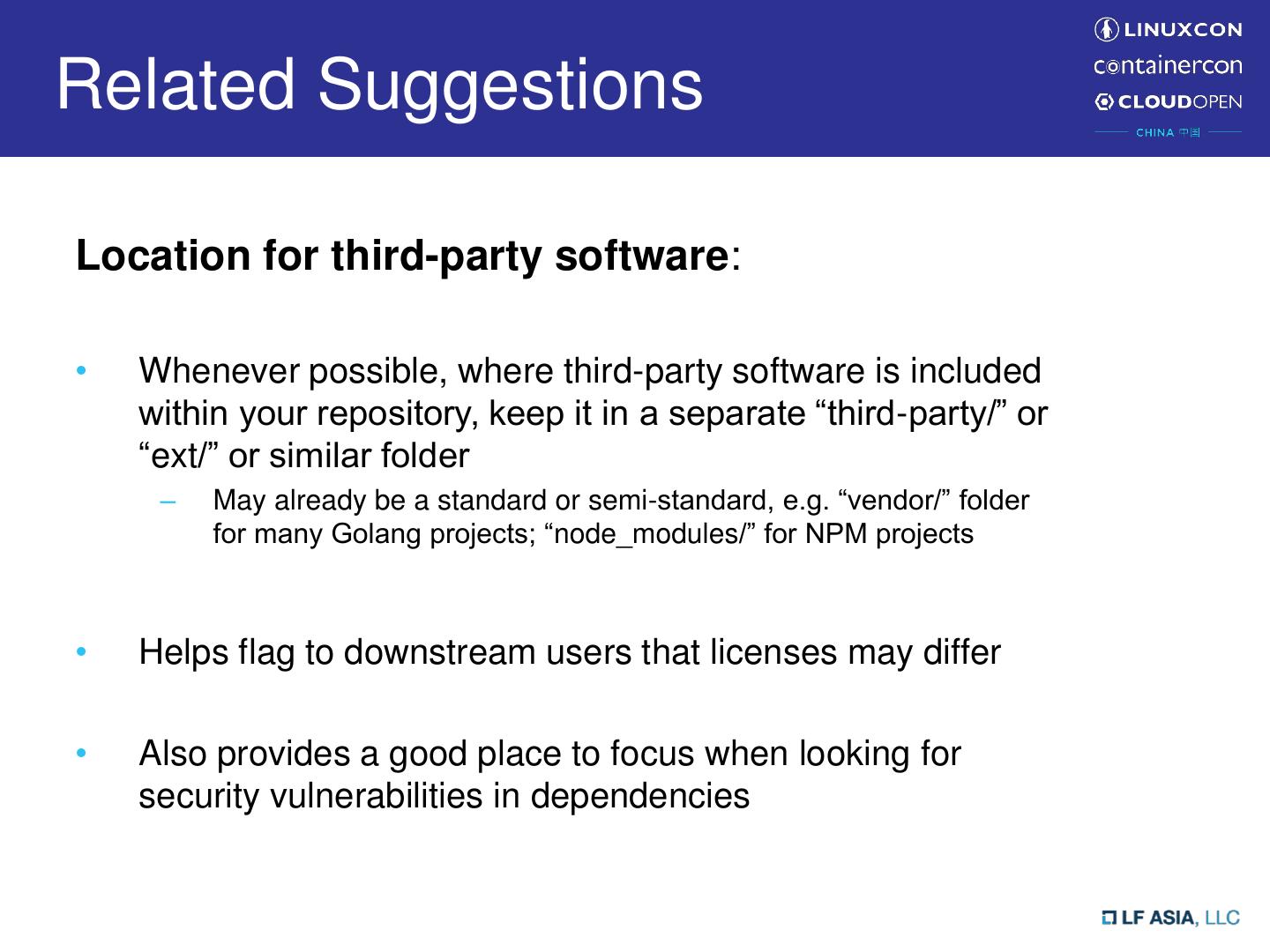 19 .Opening Up Your Source Code An existing code base might contain: • your own code • third-party proprietary code • incompatible open source licenses • missing open source licenses • puzzling license statements • your own confidentiality notices • code with snarky licenses • code with secret keys or passwords • code with security vulnerabilities • (sub)dependencies with any of the above