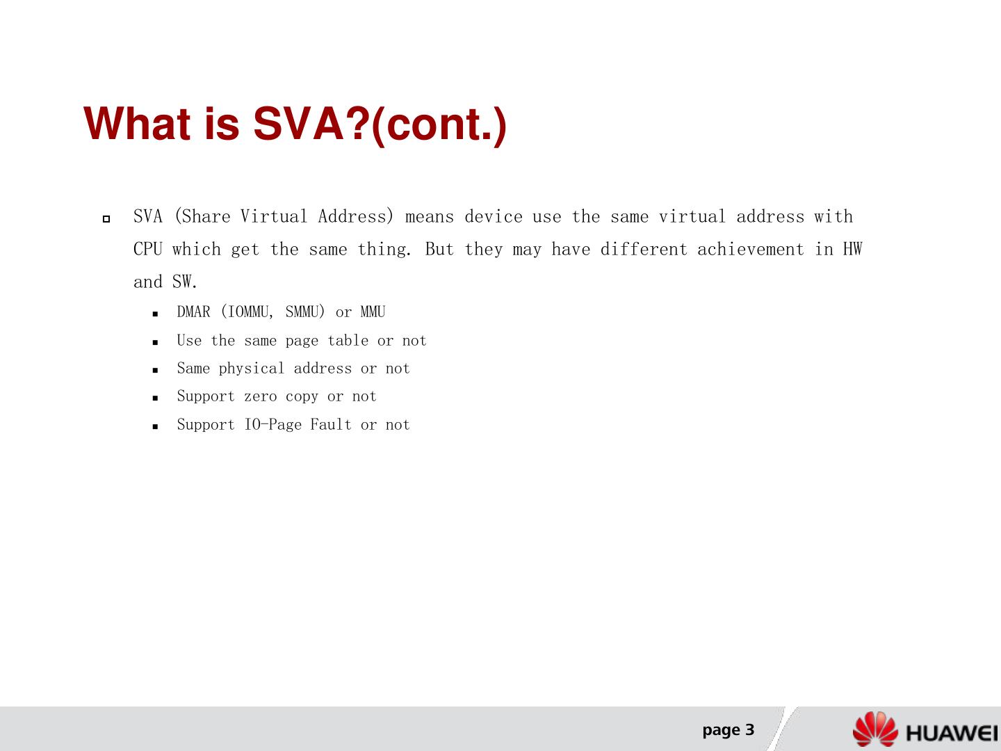 3 .What is SVA?(cont.) SVA (Share Virtual Address) means device use the same virtual address with CPU which get the same thing. But they may have different achievement in HW and SW. DMAR (IOMMU, SMMU) or MMU Use the same page table or not Same physical address or not Support zero copy or not Support IO-Page Fault or not page 3