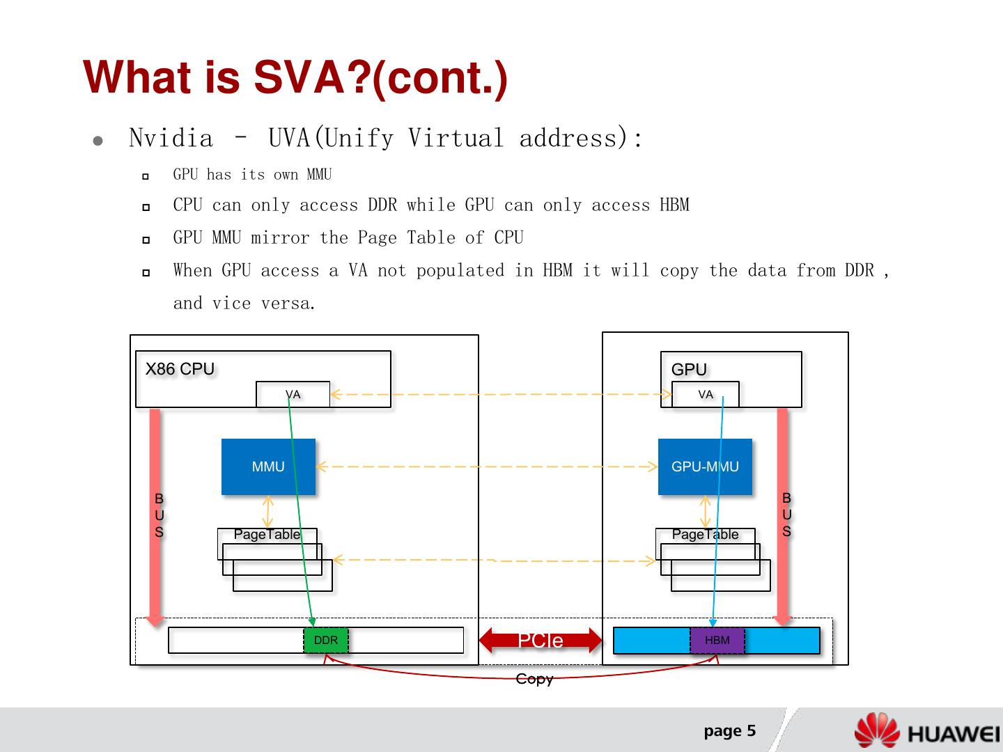 4 .What is SVA? Intel - SVM (Share Virtual Memory) : CPU access DDR through MMU Device access DDR through IOMMU MMU share the same page table with IOMMU (used by AMD’s Secure Virtual Machine in Linux) CPU Device VA VA IOMMU PASID MMU (Vt-d) B ATS ATC U S PageTable DDR PCIe page 4