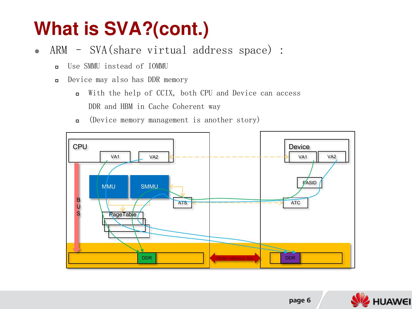 5 .What is SVA?(cont.) Nvidia – UVA(Unify Virtual address): GPU has its own MMU CPU can only access DDR while GPU can only access HBM GPU MMU mirror the Page Table of CPU When GPU access a VA not populated in HBM it will copy the data from DDR , and vice versa. X86 CPU GPU VA VA MMU GPU-MMU B B U U S PageTable PageTable S DDR PCIe HBM HBM Copy page 5