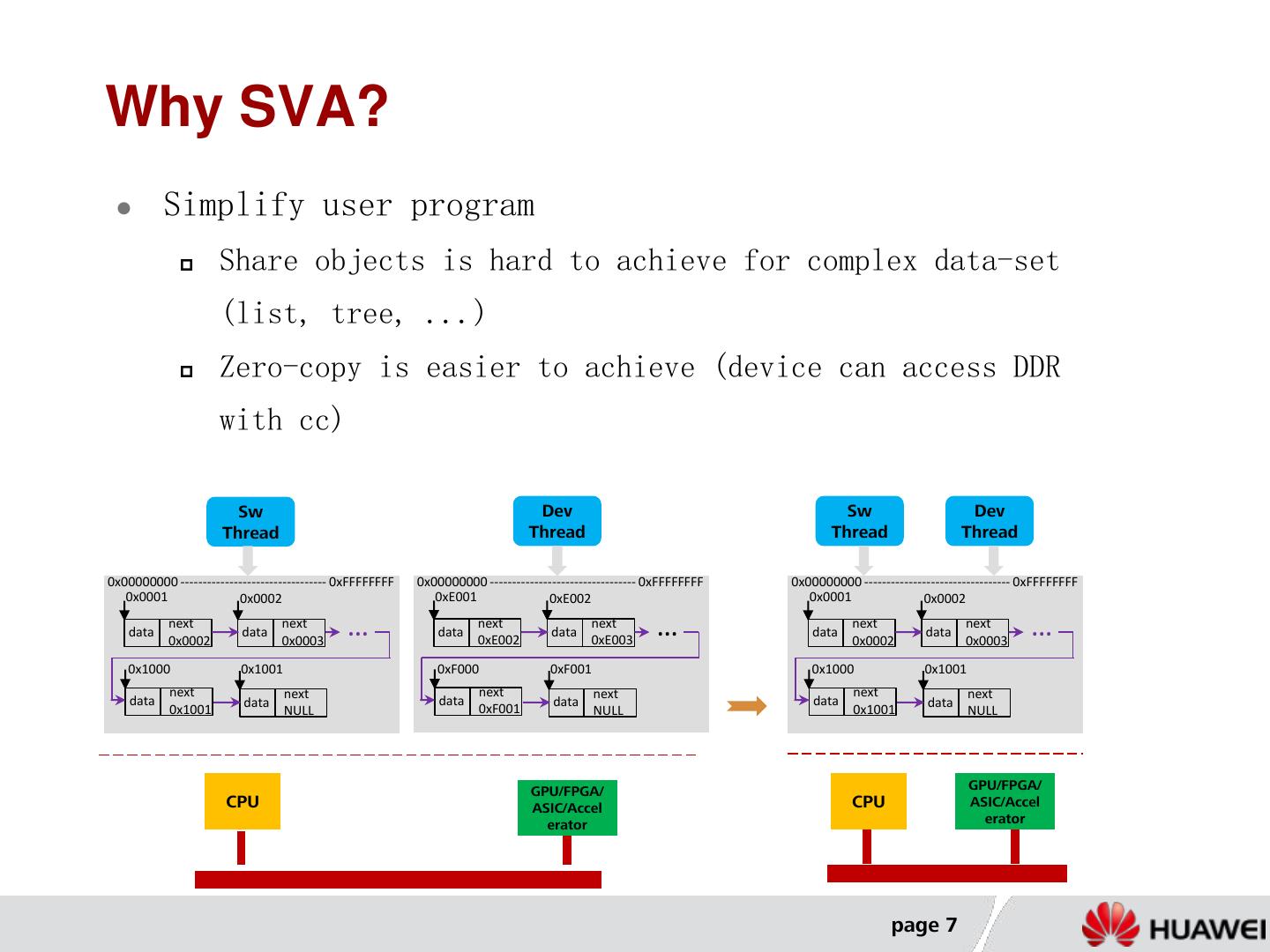 6 .What is SVA?(cont.) ARM – SVA(share virtual address space) : Use SMMU instead of IOMMU Device may also has DDR memory With the help of CCIX, both CPU and Device can access DDR and HBM in Cache Coherent way (Device memory management is another story) CPU Device VA1 VA2 VA1 VA2 PASID MMU SMMU B ATS ATC U S PageTable DDR cache coherent bus DDR page 6