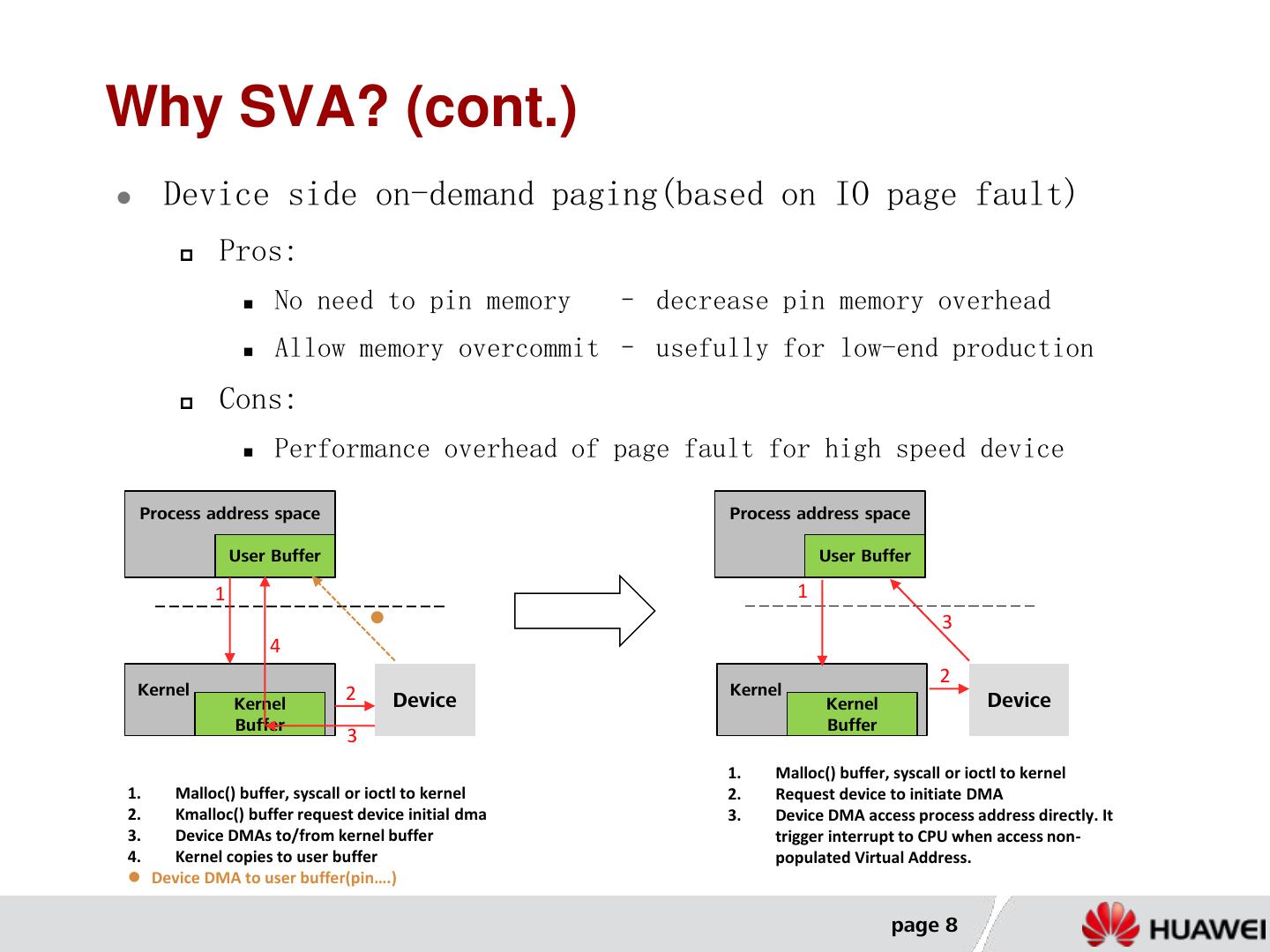 7 .Why SVA? Simplify user program Share objects is hard to achieve for complex data-set (list, tree, ...) Zero-copy is easier to achieve (device can access DDR with cc) Sw Dev Sw Dev Thread Thread Thread Thread 0x00000000 --------------------------------- 0xFFFFFFFF 0x00000000 --------------------------------- 0xFFFFFFFF 0x00000000 --------------------------------- 0xFFFFFFFF 0x0001 0x0002 0xE001 0xE002 0x0001 0x0002 data next 0x0002 data next 0x0003 … data next 0xE002 data next 0xE003 … data next 0x0002 data next 0x0003 … 0x1000 0x1001 0xF000 0xF001 0x1000 0x1001 next next next next next next data data data data data data 0x1001 NULL 0xF001 NULL 0x1001 NULL GPU/FPGA/ GPU/FPGA/ CPU ASIC/Accel CPU ASIC/Accel erator erator page 7