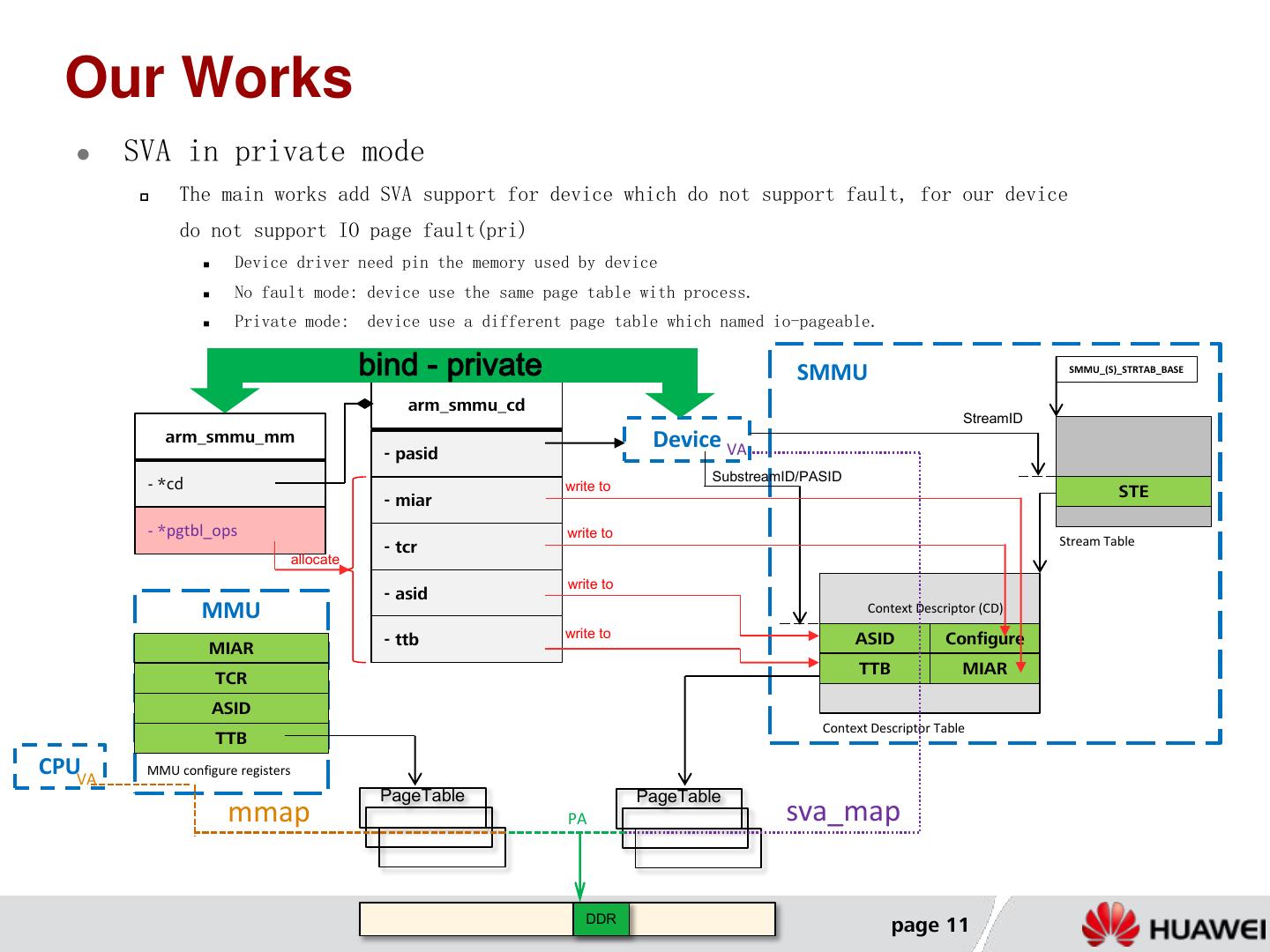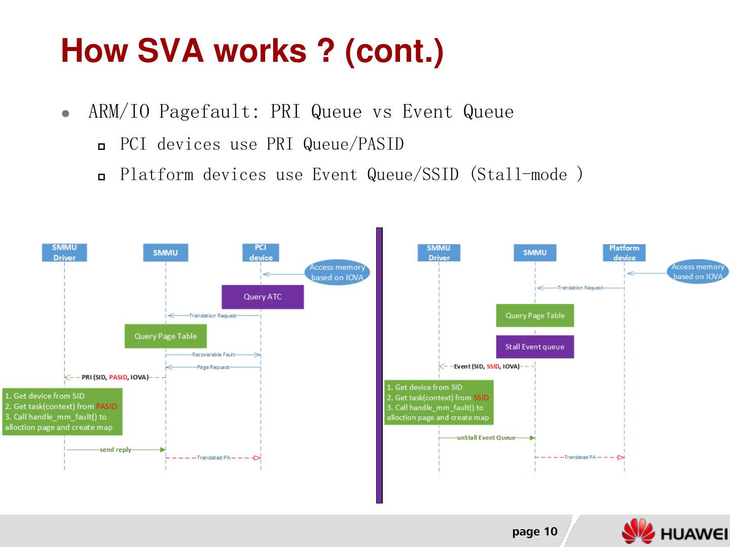 10 .How SVA works ? (cont.) ARM/IO Pagefault: PRI Queue vs Event Queue PCI devices use PRI Queue/PASID Platform devices use Event Queue/SSID (Stall-mode ) page 10