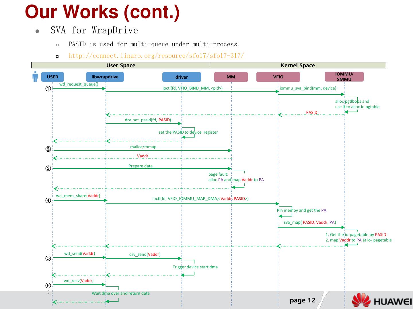 11 . Our Works SVA in private mode The main works add SVA support for device which do not support fault, for our device do not support IO page fault(pri) Device driver need pin the memory used by device No fault mode: device use the same page table with process. Private mode: device use a different page table which named io-pageable. bind - private SMMU SMMU_(S)_STRTAB_BASE arm_smmu_cd StreamID arm_smmu_mm Device VA - pasid SubstreamID/PASID - *cd write to STE - miar - *pgtbl_ops write to - tcr Stream Table allocate write to - asid MMU Context Descriptor (CD) - ttb write to ASID Configure MIAR TTB MIAR TCR ASID Context Descriptor Table TTB CPUVA MMU configure registers PageTable PageTable mmap PA sva_map DDR page 11