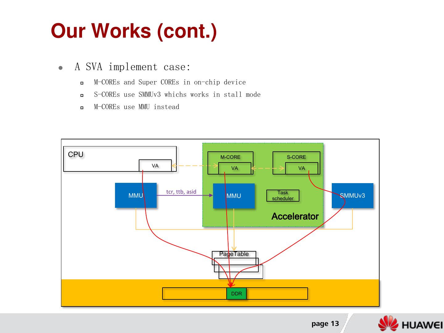 13 .Our Works (cont.) A SVA implement case: M-COREs and Super COREs in on-chip device S-COREs use SMMUv3 whichs works in stall mode M-COREs use MMU instead CPU M-CORE S-CORE VA VA VA PASID tcr, ttb, asid Task MMU MMU scheduler SMMUv3 Accelerator PageTable DDR page 13