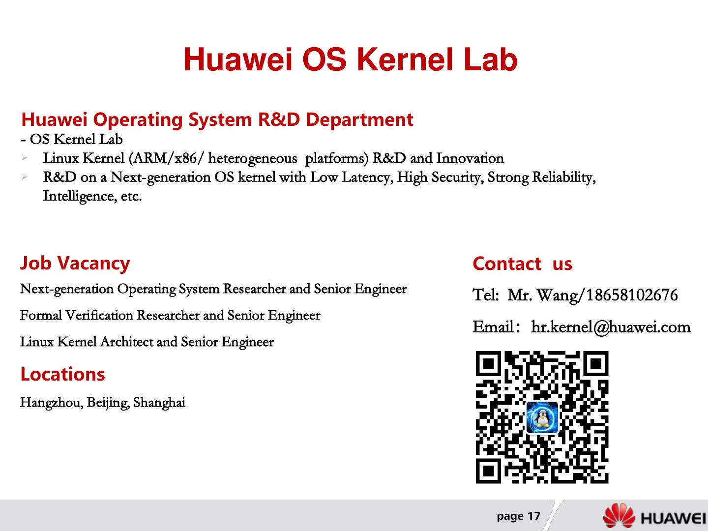 17 . Huawei OS Kernel Lab Huawei Operating System R&D Department - OS Kernel Lab Linux Kernel (ARM/x86/ heterogeneous platforms) R&D and Innovation R&D on a Next-generation OS kernel with Low Latency, High Security, Strong Reliability, Intelligence, etc. Job Vacancy Contact us Next-generation Operating System Researcher and Senior Engineer Tel: Mr. Wang/18658102676 Formal Verification Researcher and Senior Engineer Email:hr.kernel@huawei.com Linux Kernel Architect and Senior Engineer Locations Hangzhou, Beijing, Shanghai page 17