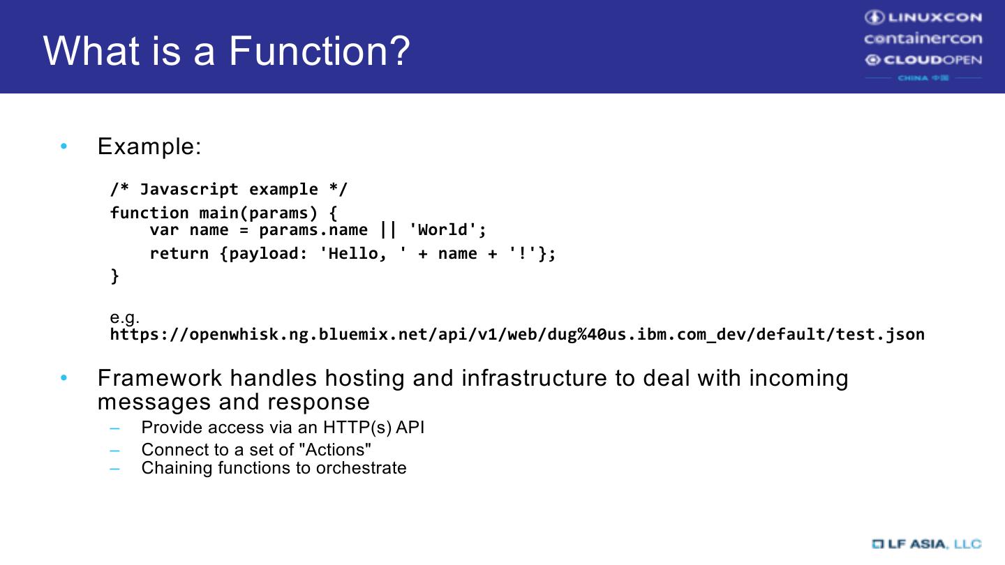 5 .What is a Function? • Example: /* Javascript example */ function main(params) { var name = params.name || 'World'; return {payload: 'Hello, ' + name + '!'}; } e.g. https://openwhisk.ng.bluemix.net/api/v1/web/dug%40us.ibm.com_dev/default/test.json • Framework handles hosting and infrastructure to deal with incoming messages and response – Provide access via an HTTP(s) API – Connect to a set of "Actions" – Chaining functions to orchestrate