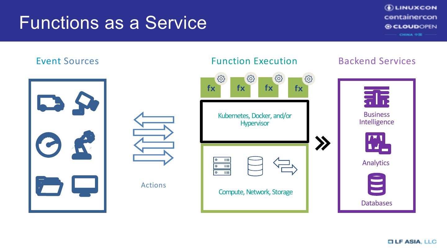 6 .Functions as a Service Event Sources Function Execution Backend Services Kubernetes, Docker, and/or Business Hypervisor Intelligence Analytics Actions Compute, Network, Storage Databases