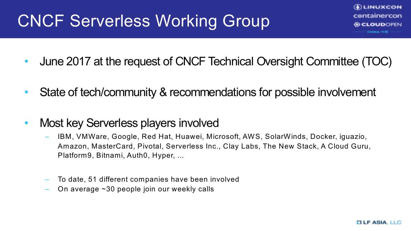 11 .CNCF Serverless Working Group • June 2017 at the request of CNCF Technical Oversight Committee (TOC) • State of tech/community & recommendations for possible involvement • Most key Serverless players involved – IBM, VMWare, Google, Red Hat, Huawei, Microsoft, AW S, SolarW inds, Docker, iguazio, Amazon, MasterCard, Pivotal, Serverless Inc., Clay Labs, The New Stack, A Cloud Guru, Platform9, Bitnami, Auth0, Hyper, ... – To date, 51 different companies have been involved – On average ~30 people join our weekly calls