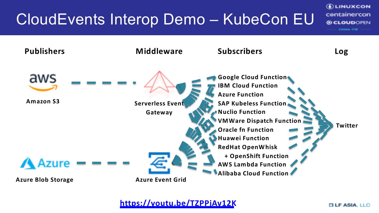 19 .CloudEvents Interop Demo – KubeCon EU Publishers Middleware Subscribers Log Google Cloud Function IBM Cloud Function Azure Function Amazon S3 Serverless Event SAP Kubeless Function Gateway Nuclio Function VM Ware Dispatch Function Twitter Oracle fn Function Huawei Function RedHat OpenW hisk + OpenShift Function AW S Lambda Function Alibaba Cloud Function Azure Blob Storage Azure Event Grid https://youtu.be/TZPPjAv12K