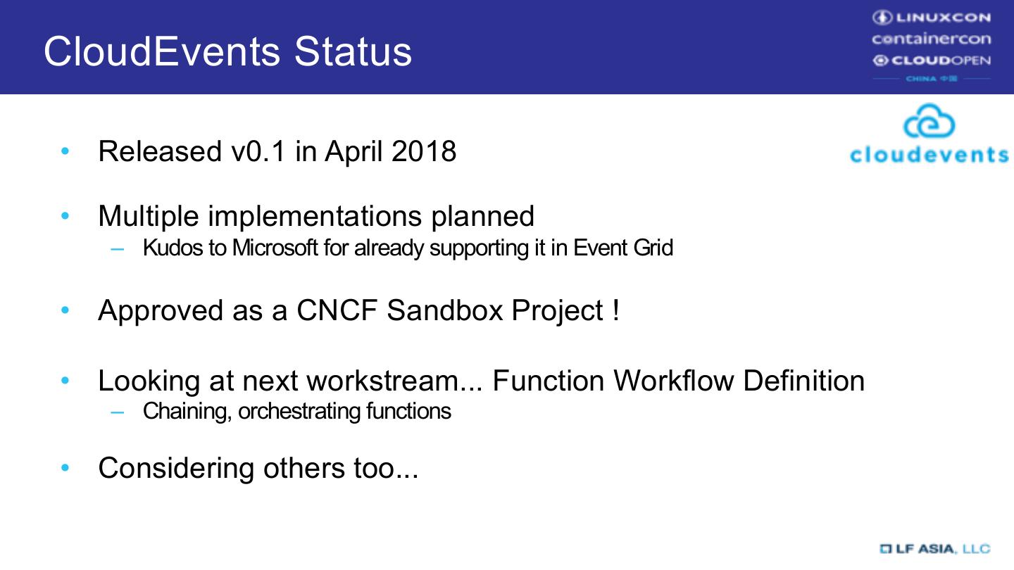 21 .CloudEvents Status • Released v0.1 in April 2018 • Multiple implementations planned – Kudos to Microsoft for already supporting it in Event Grid • Approved as a CNCF Sandbox Project ! • Looking at next workstream... Function Workflow Definition – Chaining, orchestrating functions • Considering others too...