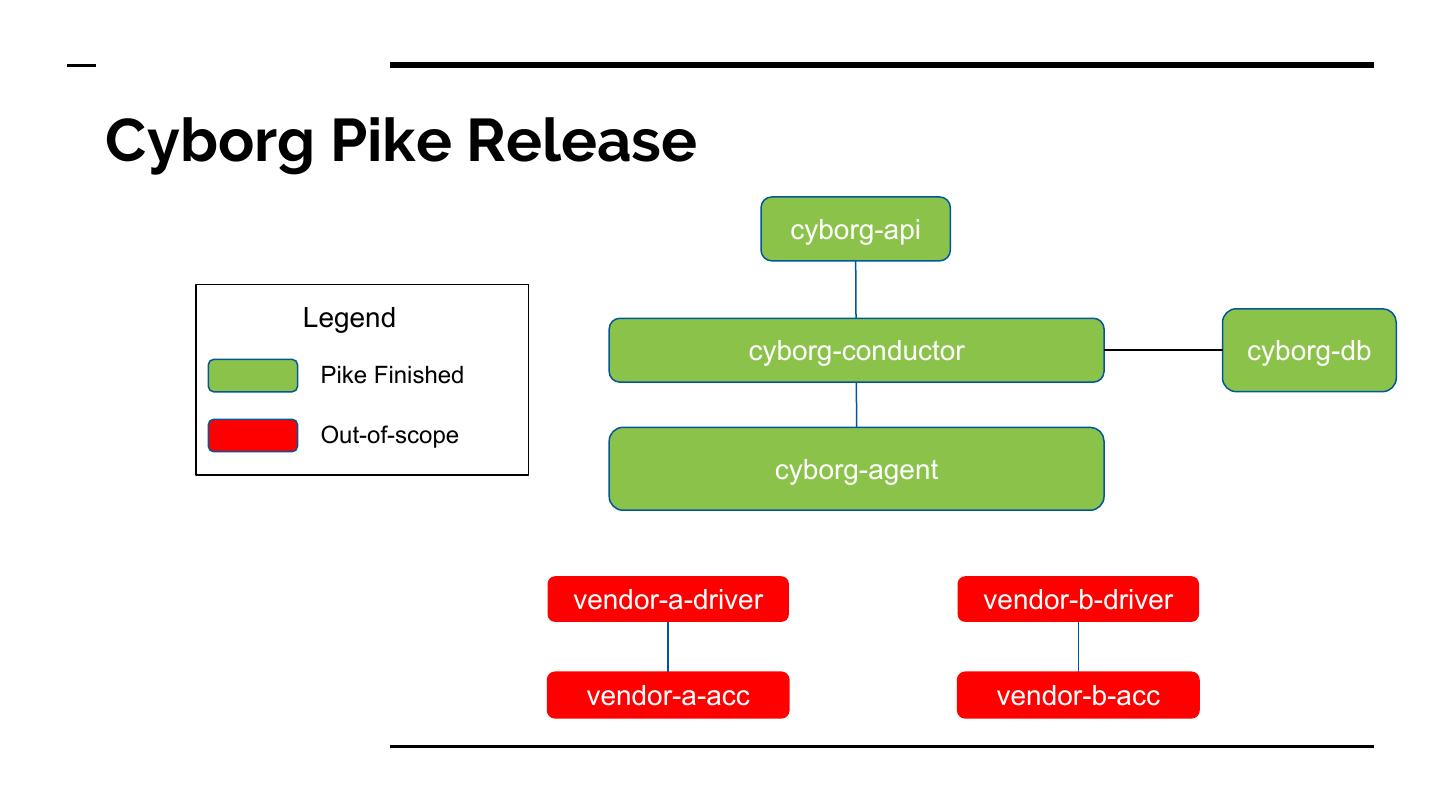 11 .Cyborg Pike Release cyborg-api Legend cyborg-conductor cyborg-db Pike Finished Out-of-scope cyborg-agent vendor-a-driver vendor-b-driver vendor-a-acc vendor-b-acc